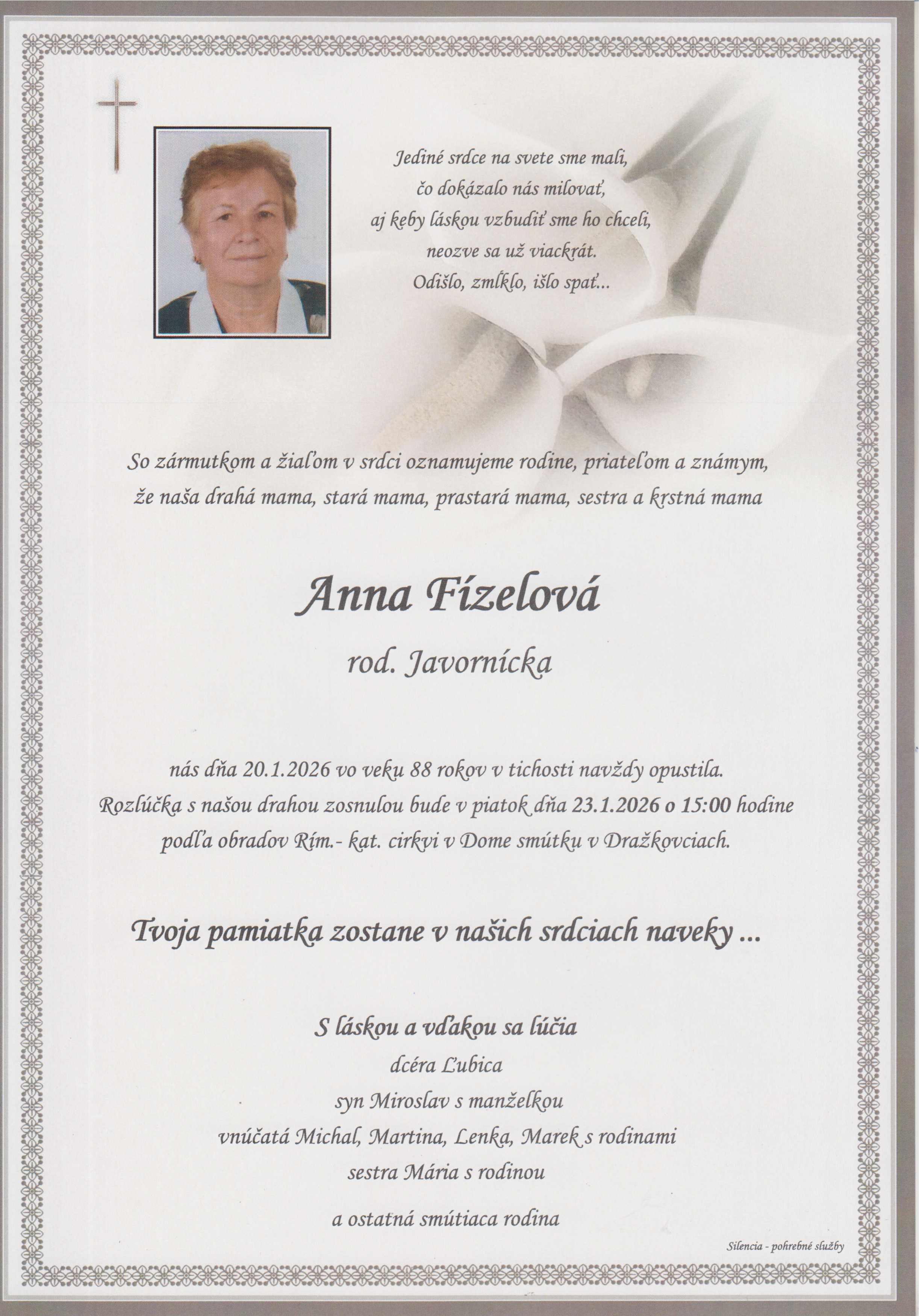 Nech stará mama Anička odpočíva v pokoji a v nebi stretne všetkých svojich drahých zosnulých 🖤🖤 Pozostalým vyjadrujem úprimnú sústrasť a posielam veľa sily pri prekonaní veľkého smútku..nech spomienky na všetko krásne, čo ste s ňou prežili nikdy nevyblednú a prinesú úľavu do Vašich duší 🖤