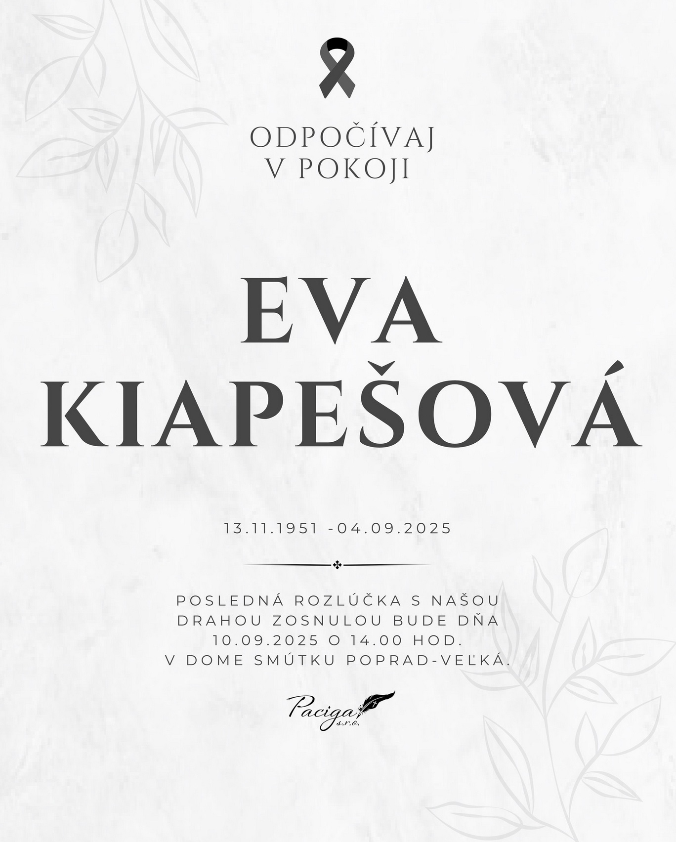 Som veľmi smutná, že zomrela Evka Kiapešová. Boli sme spolu na VŠMU na rovnakom odbore, na internátoch, v meste BA, Karlovej Vsi, Petržalke, na koncertoch, na oslavách, na mnohých kávičkových posednieach, aj v hudobnej redakcii v rozhlase. Žiaľ, v posledných rokoch sme sa dlho nevideli, nepočuli, nestretli... slovom život nás posunul... Evka mala náklazlivý smiech a dobré srdce... Nech si ju Pánbožko zoberie pod ochranu. Z pozemskej Petržky Meška.