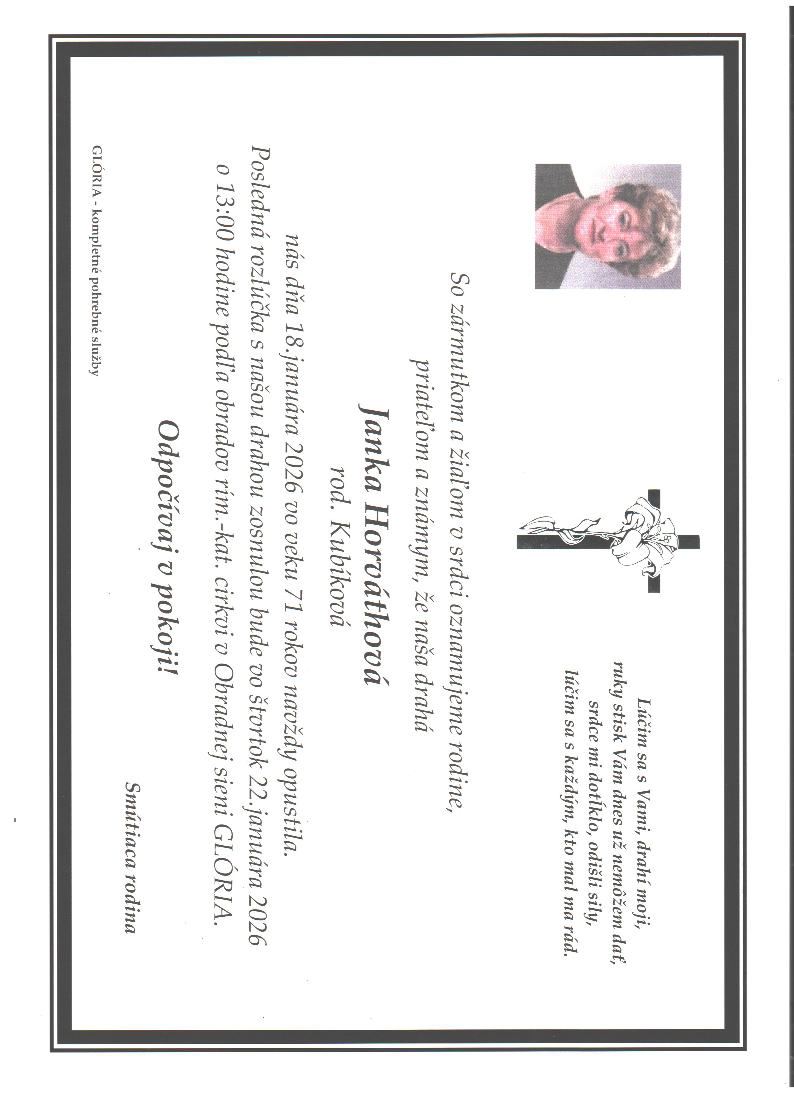 Pohreb zabezpečuje: Pohrebníctvo Glória Prešov