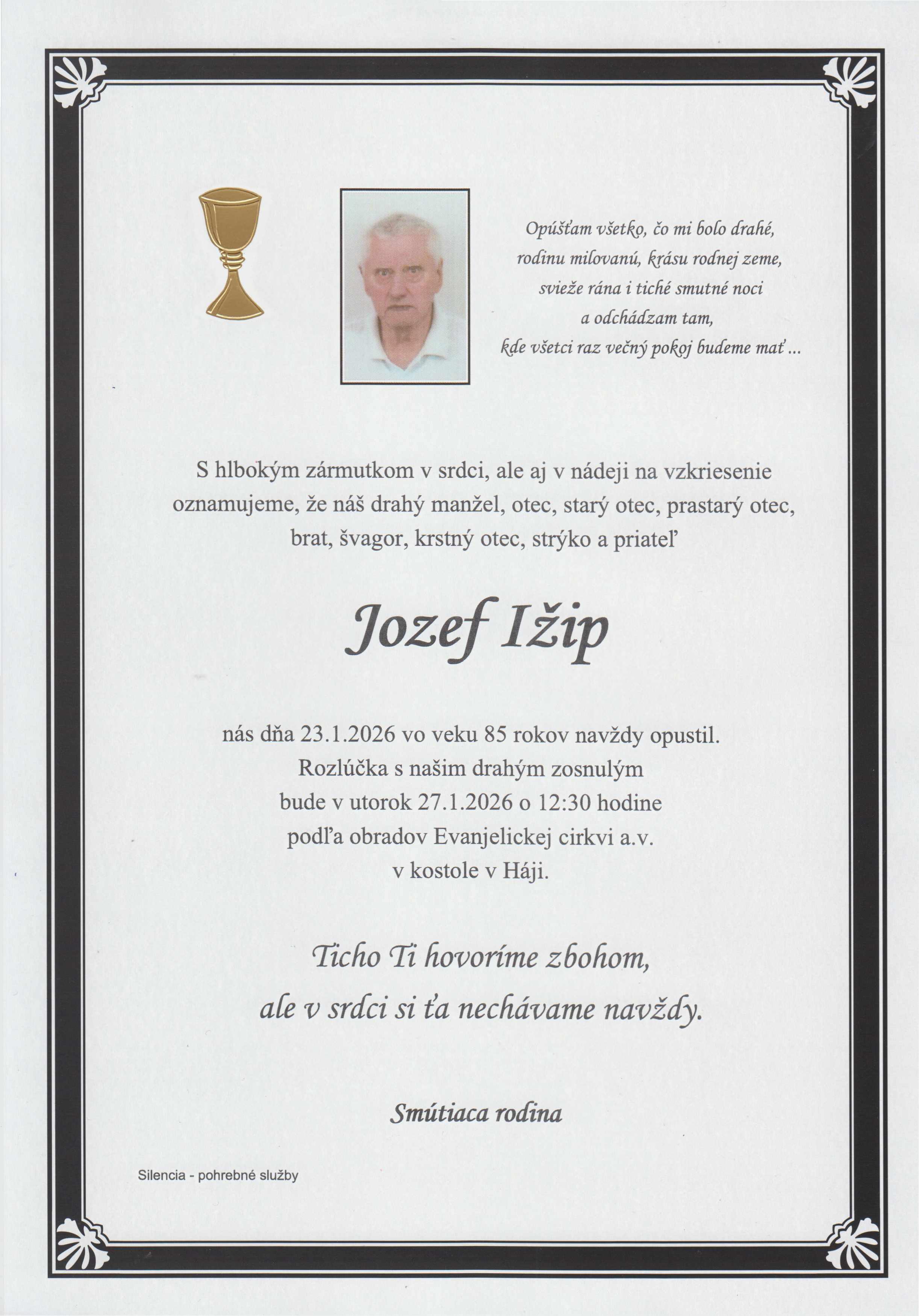 Úprimnú sústrasť . V duši sa zotmelo,v srdci je chlad, odišiel niekto, kto život mal tak rád... Ťažké sú slová útechy, keď príde čas rozlúčky a len spomienky zostávajú v nás...