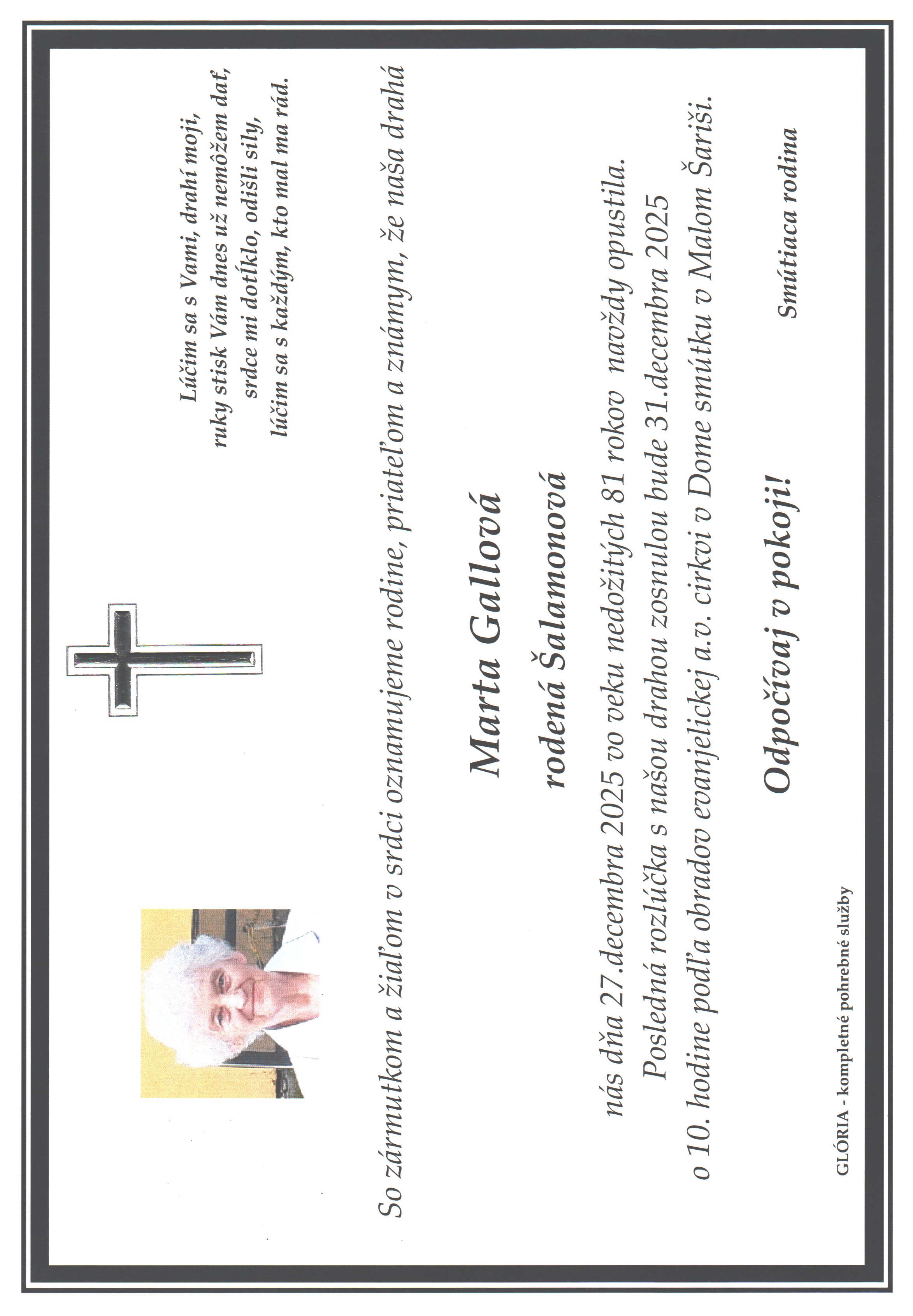 Pohreb zabezpečuje: Pohrebníctvo Glória Prešov