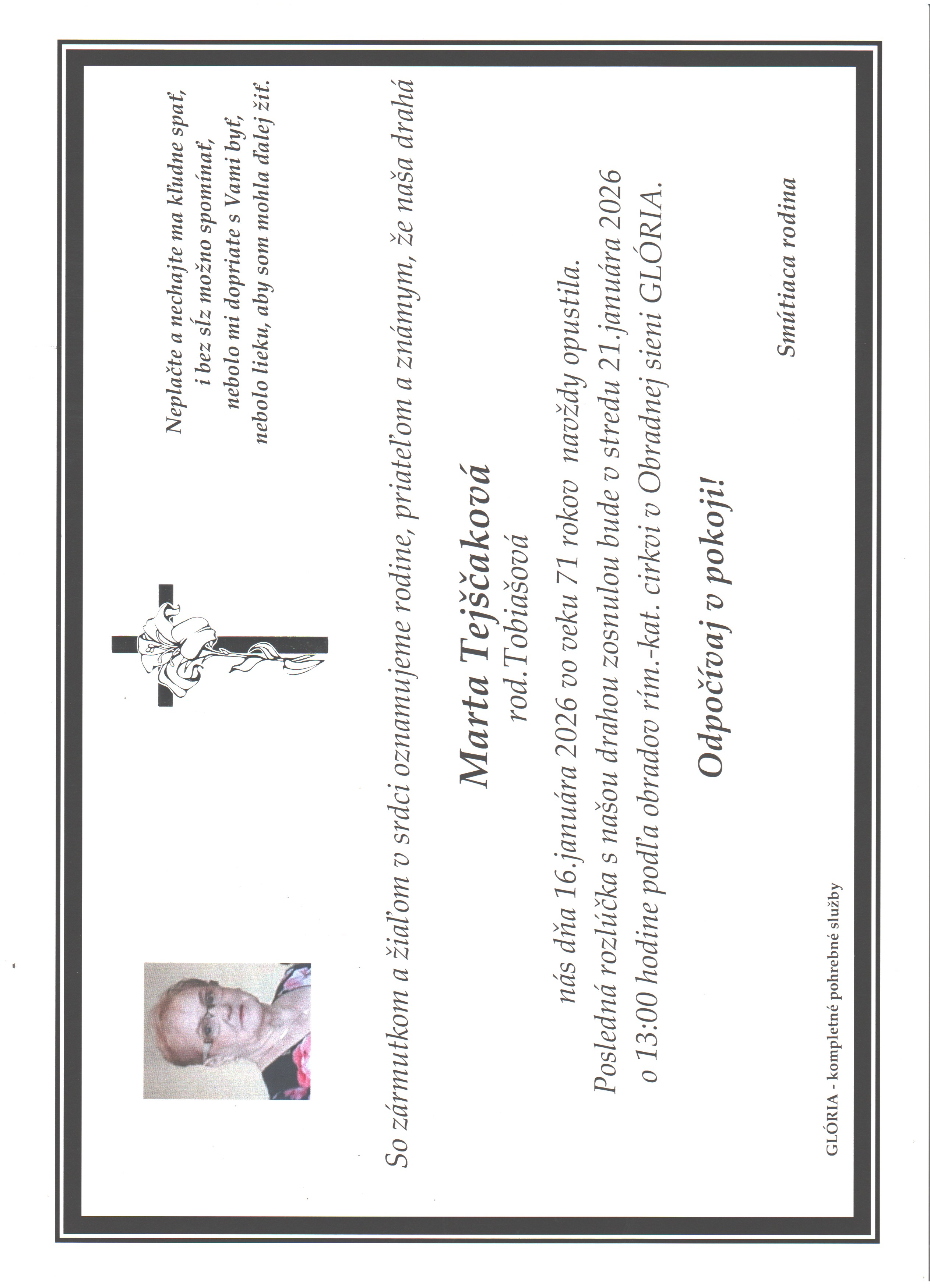 Pohreb zabezpečuje: Pohrebníctvo Glória Prešov