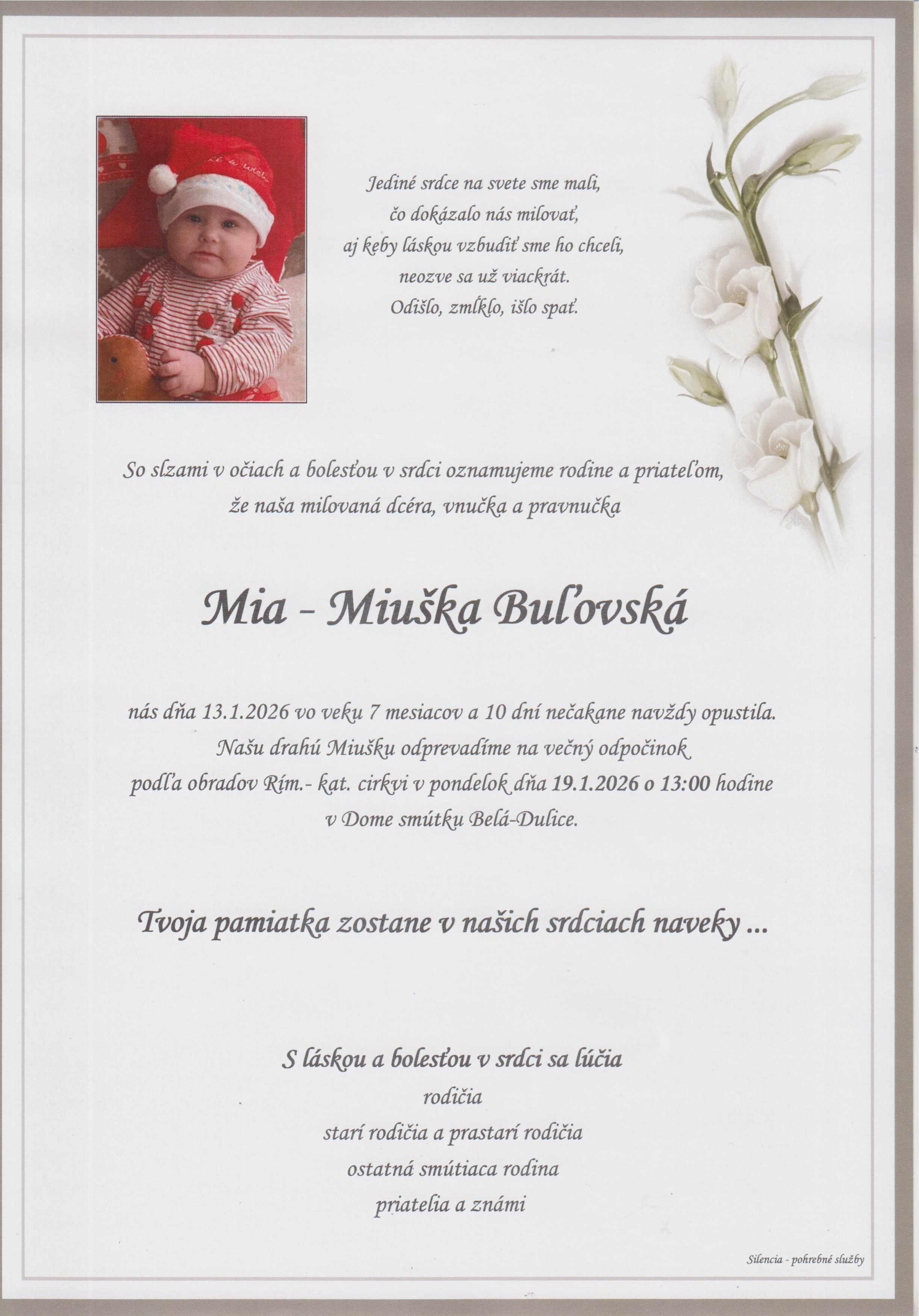 Srdiečko a už teraz anjelik medzi hviezdami a v nebíčku. Úprimnú sústrasť prajeme, ale vlastne ani nevieme poriadne komu. Ale Miuška anjelik, síce sme ťa nepoznali ale modlíme sa za teba každý deň a každým dňom. Dúfam tvoja mala nevinná dušička je už na lepšom a spokojnejšom mieste. Už ti nebude nikto ubližovať toho sa báť už nemusíš. Myslíme na teba anjelik a budeme stíť tvoju pamiatku navždy. Odpočívaj v pokoji 🕊️🕊️🕊️