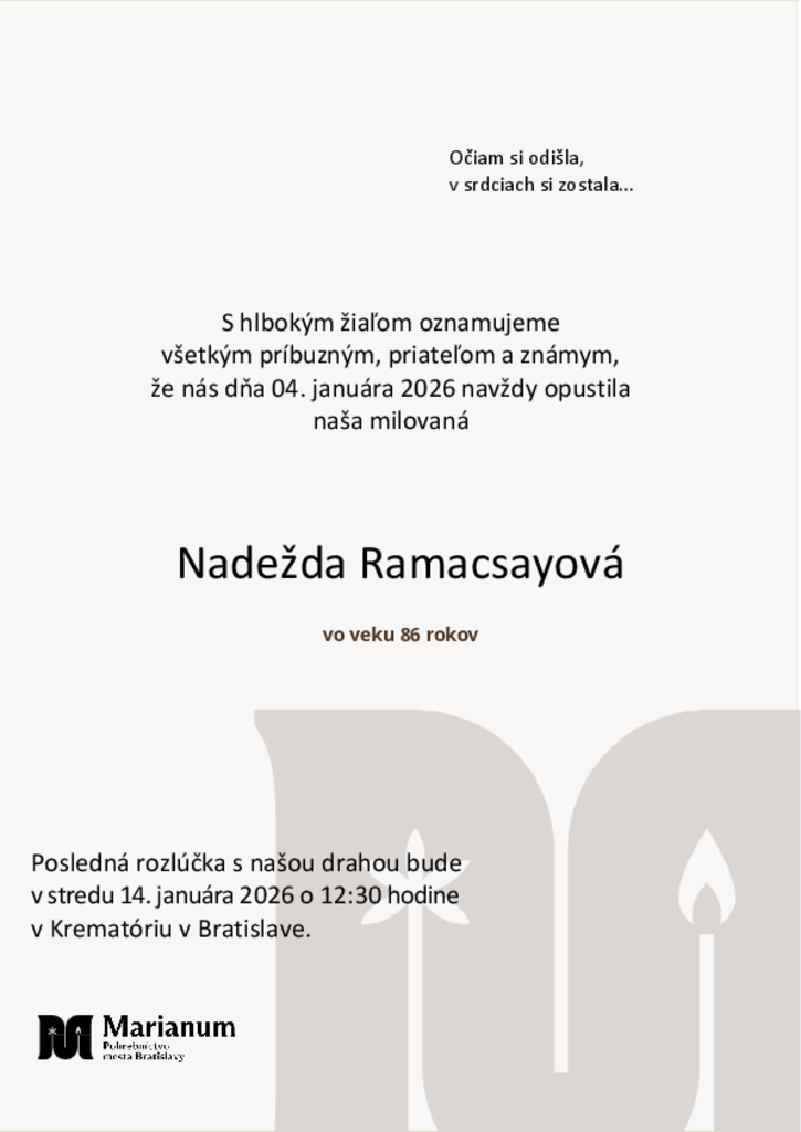 So žiaľom v srdci som prijal správu, že vaša babka, prababka, sestra Nadežda Ramacsayová náhle nás opustila. Žil som u nej niekoľko rokov v podnájme a zistil som, že má veľké dobré srdiečko. Prijmite, prosím, moju úprimnú účasť na vašom žiali. V mojej pamäti však zostane navždy zachovaná.