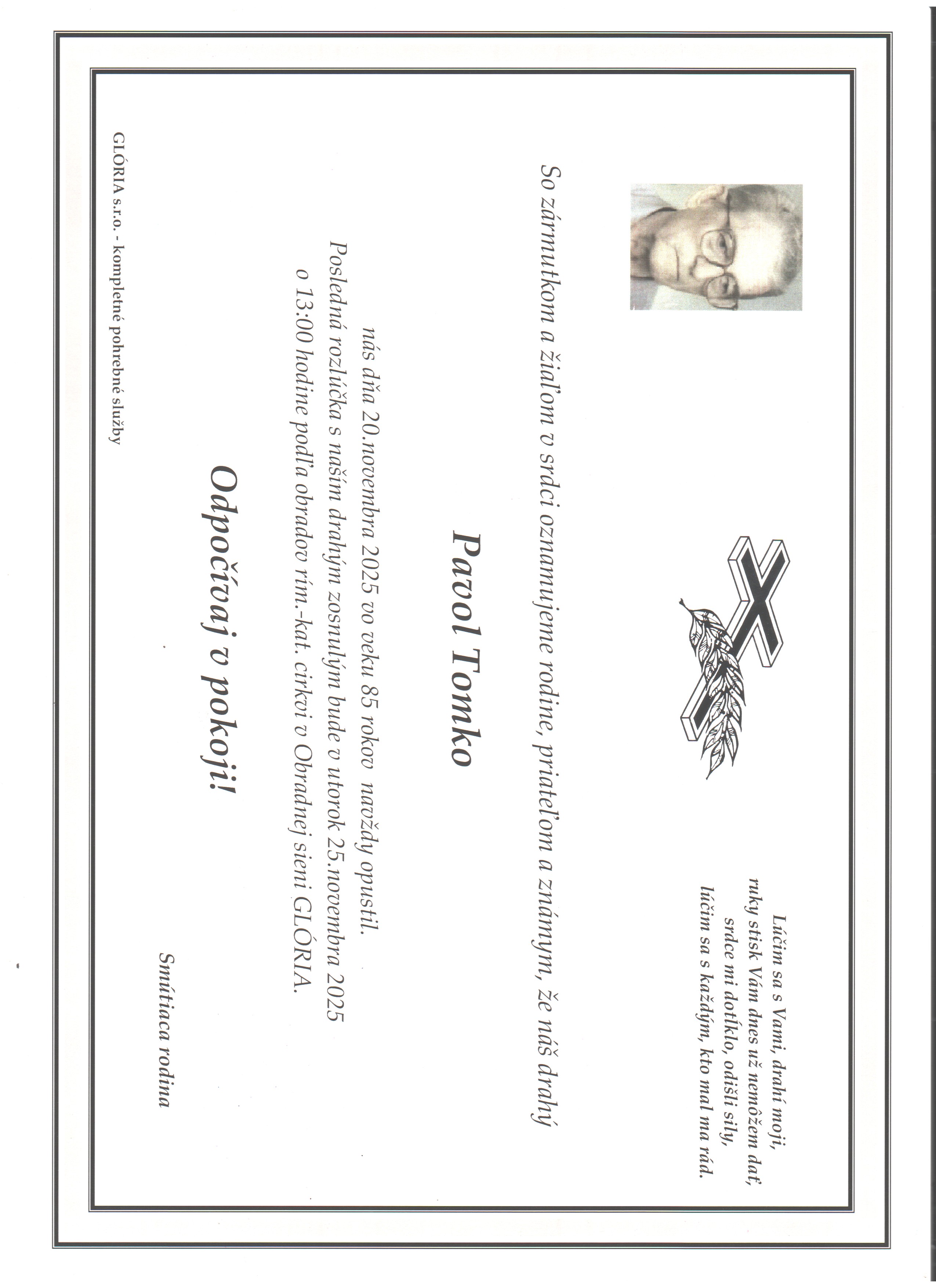 Pohreb zabezpečuje: Pohrebníctvo Glória Prešov