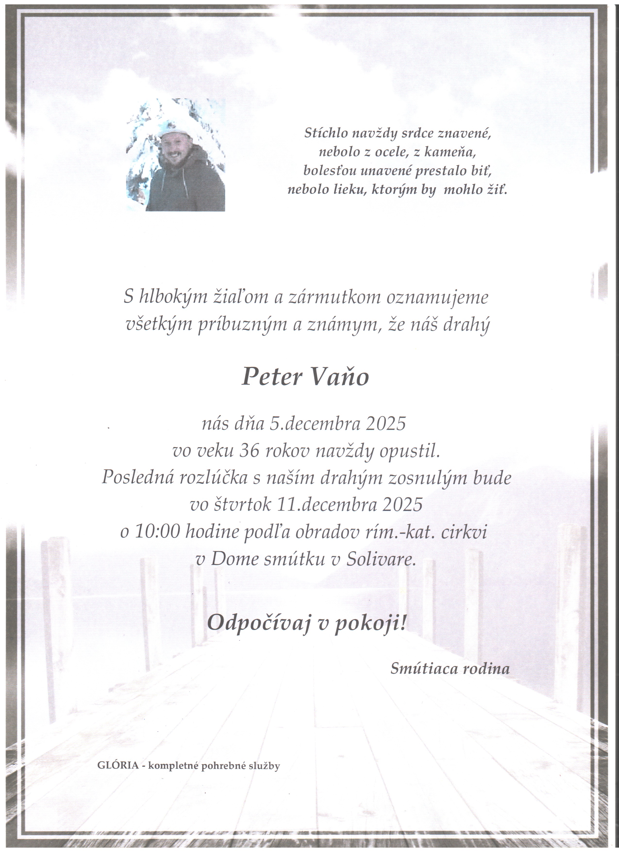 Vážená rodina,s hlbokým smútkom sme sa dozvedeli o odchode Peťa do večného svetla. 🖤 Bol osobou, ktorá niesla úsmev ako dar od Boha, vždy pripravený rozosmiať ostatných do sĺz radosťou a nehou. Jeho schopnosť starať sa o deti bola ako umenie lásky – trpezlivé, teplé a plné múdrosti, ktorá formovala mladé duše. Ako hovorí Písmo: „Blahoslavení plačúci, lebo oni sa utiešia“ (Mt 5,4). Nech jeho svetlo žije v spomienkach a nech Pán ho privítal do svojho domu. 🕯️🙏Úprimná sústrasť a modlitby.