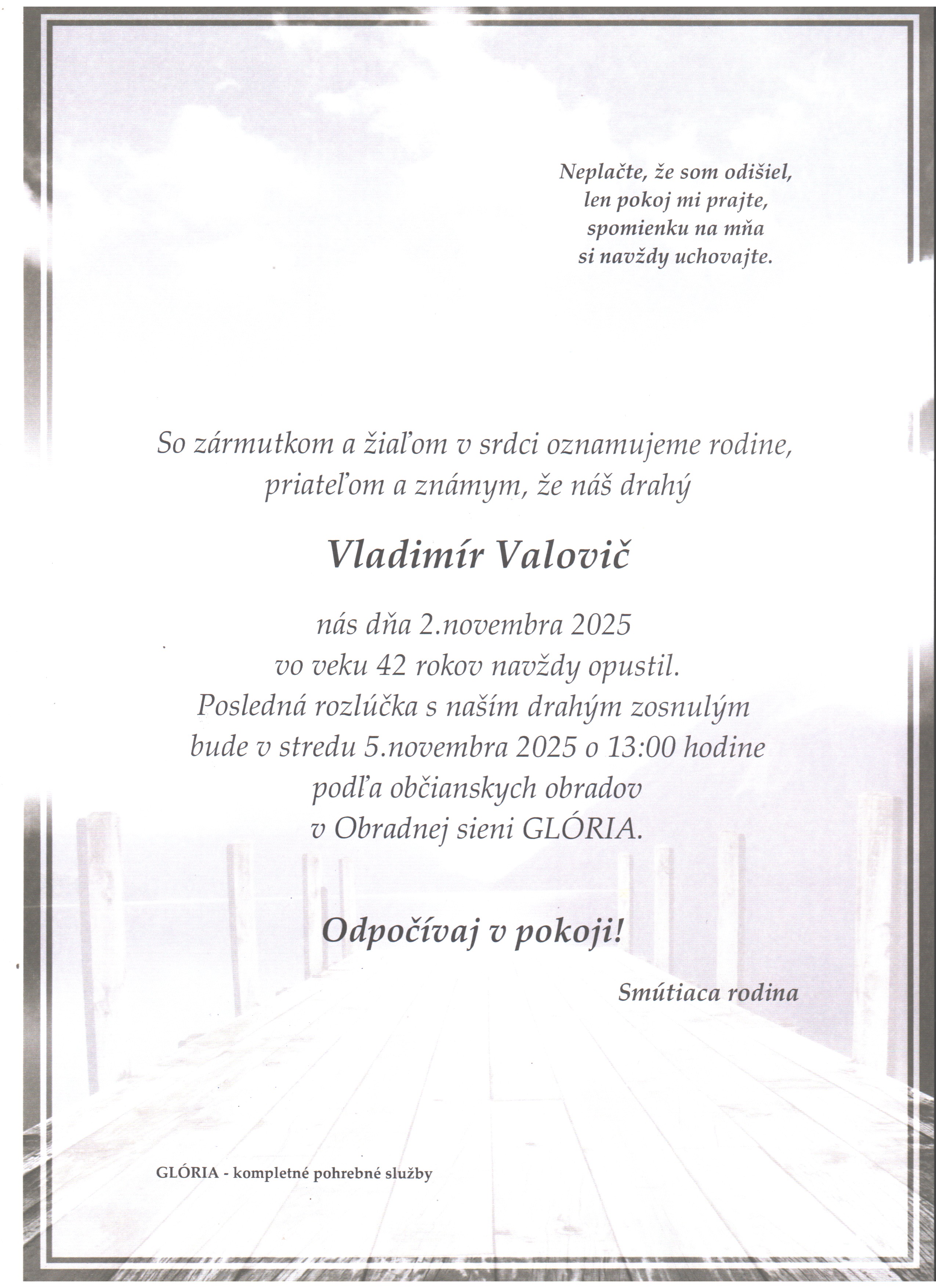 Pohreb zabezpečuje: Pohrebníctvo Glória Prešov