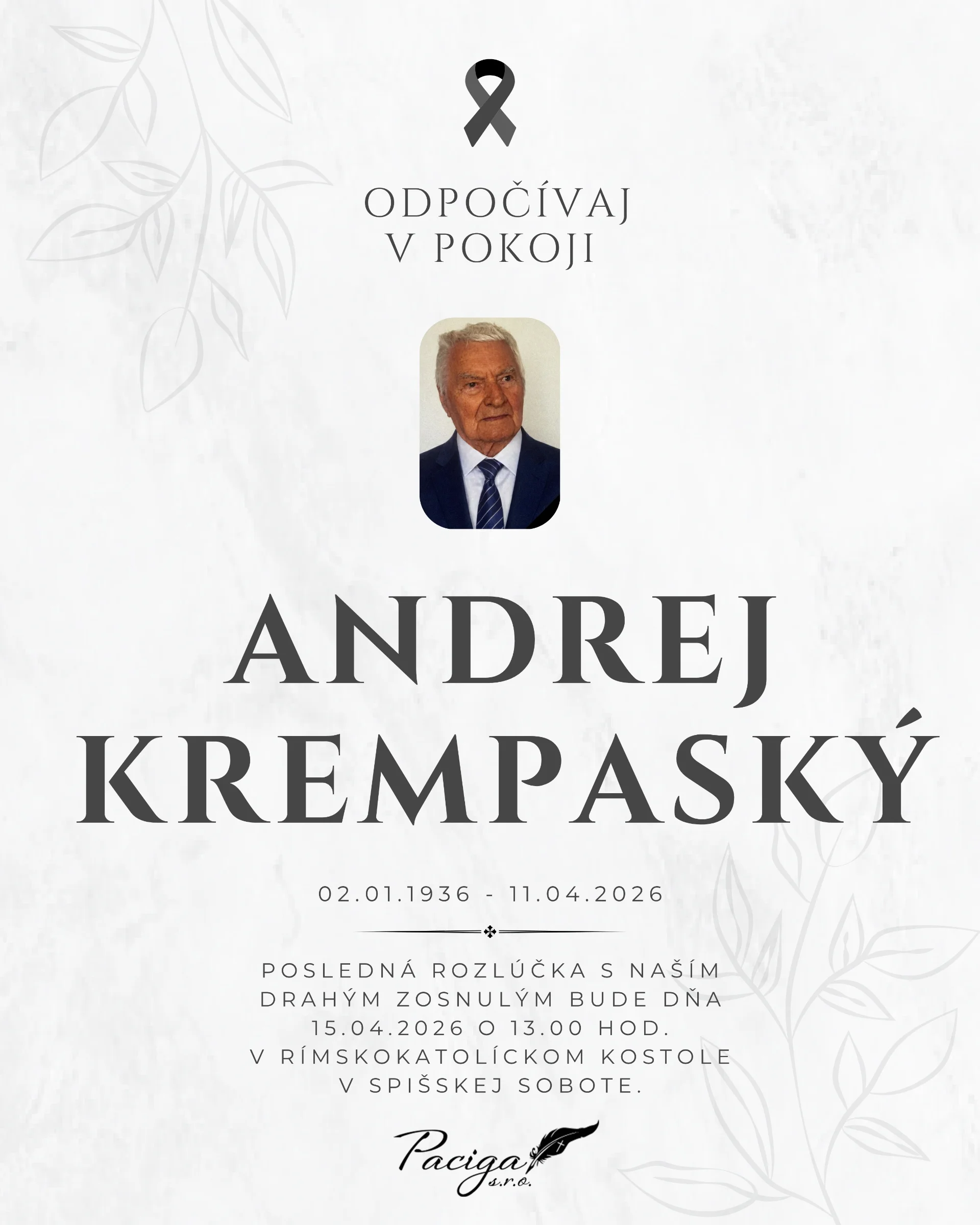Kolektív Pohrebnej služby Paciga sa pripája k prejavom sústrasti a vyjadruje účasť všetkým pozostalým. Nech Vám zostane oporou láskavá spomienka.