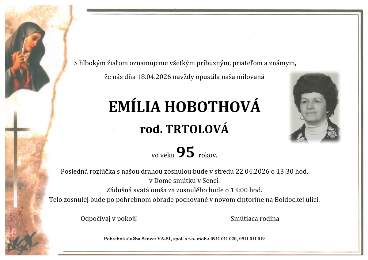 Zádušná svätá omša za zosnulú sa uskutoční 22.04.2026 o 13:00 hodine v rímskokatolíckom kostole Svätého Mikuláša v Senci