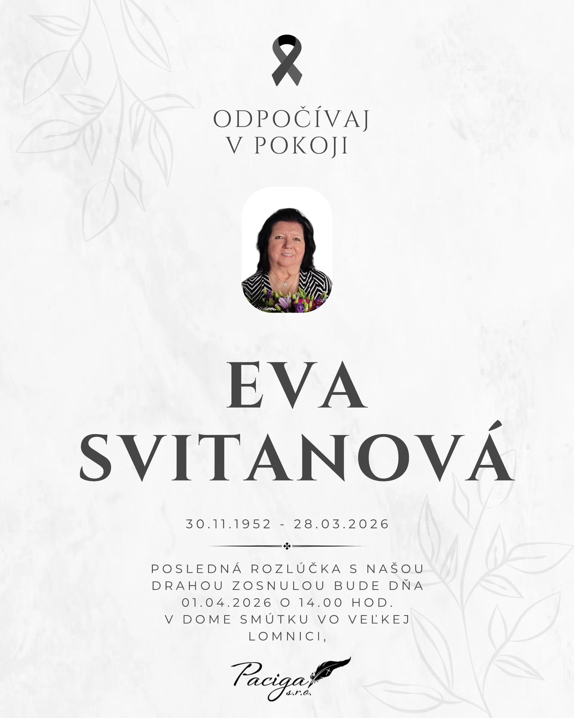 Kolektív Pohrebnej služby Paciga sa pripája k prejavom sústrasti a vyjadruje účasť všetkým pozostalým. Nech Vám zostane oporou láskavá spomienka.