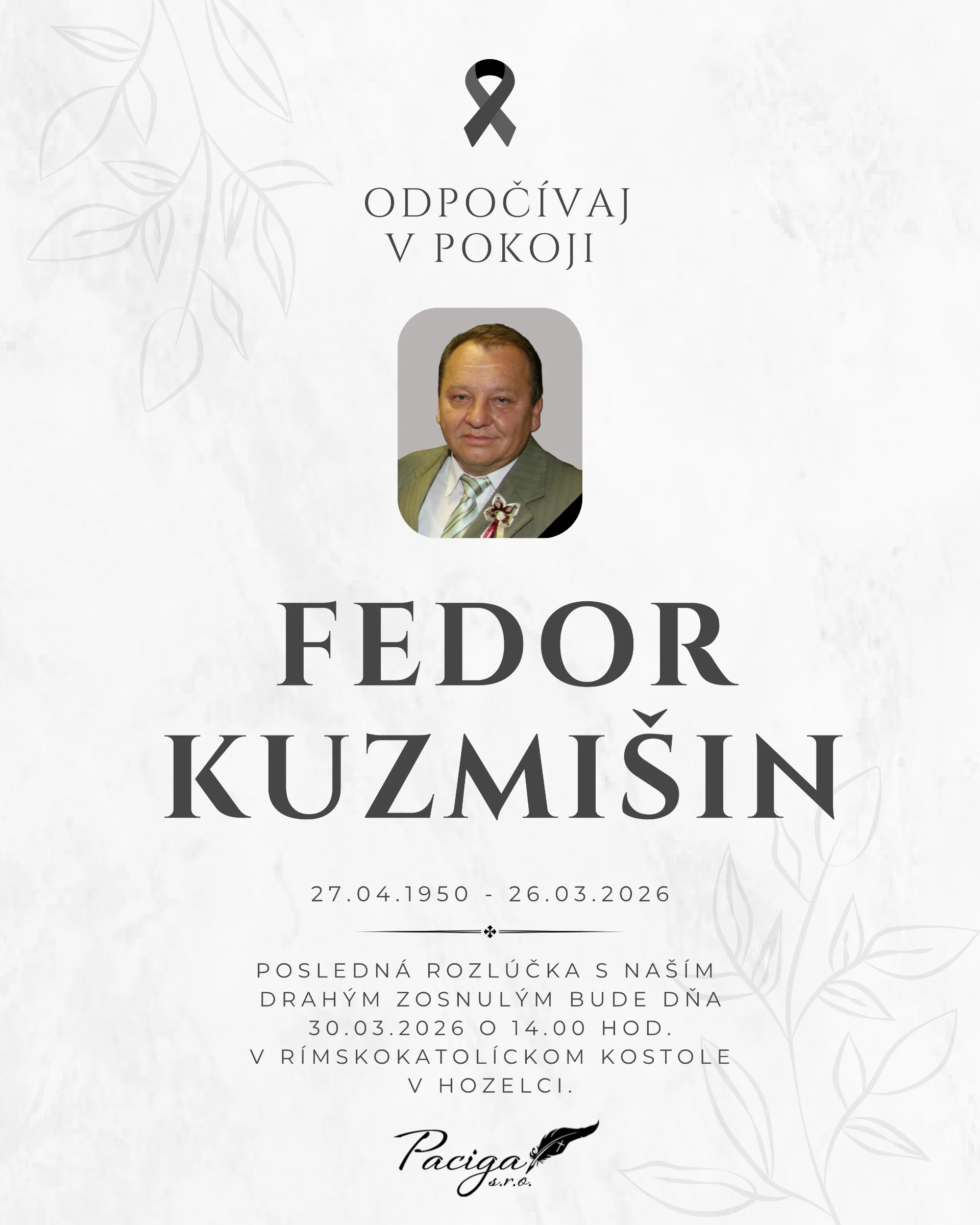 Kolektív Pohrebnej služby Paciga sa pripája k prejavom sústrasti a vyjadruje účasť všetkým pozostalým. Nech Vám zostane oporou láskavá spomienka.