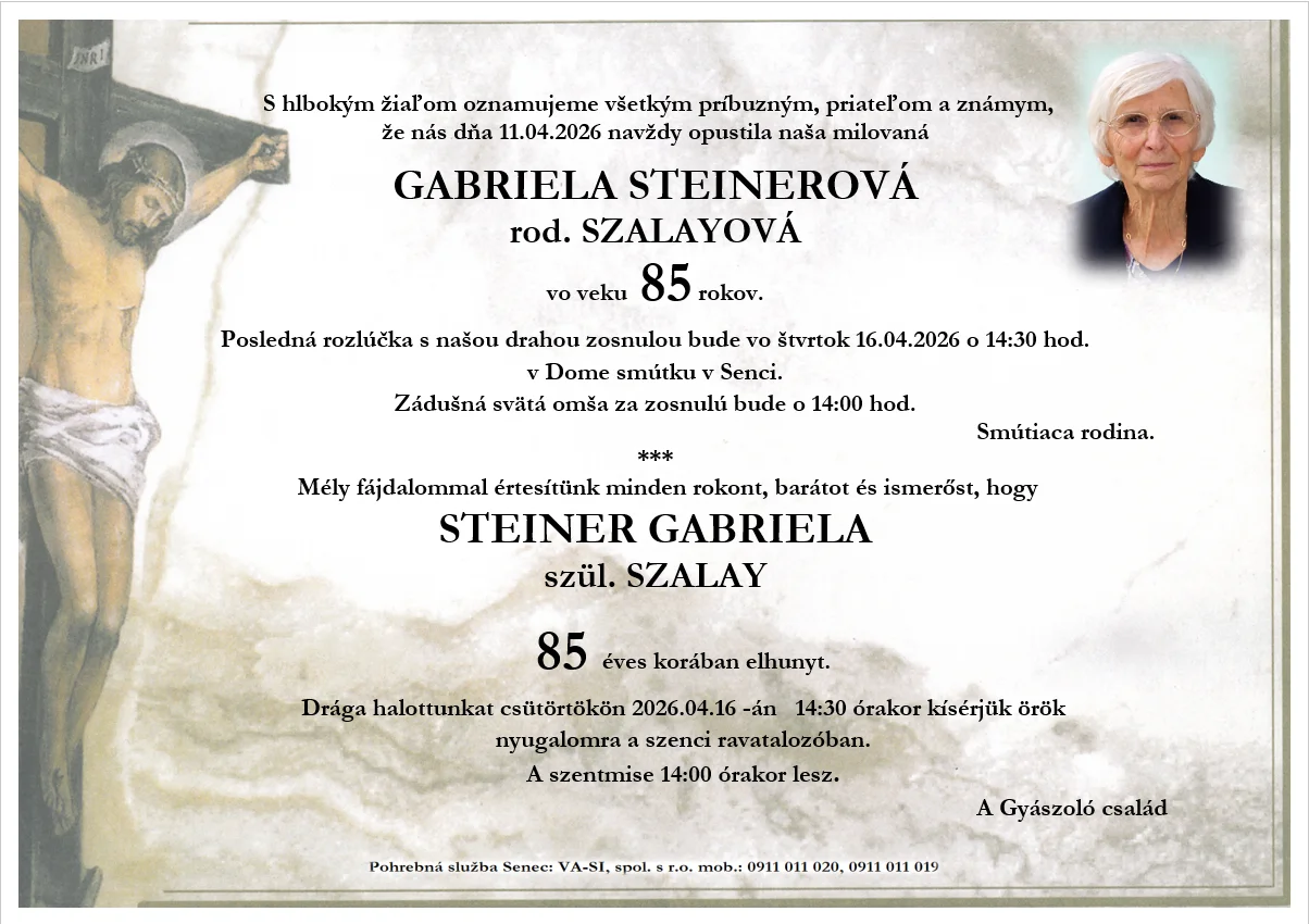 Zádušná svätá omša za zosnulú bude o 14:00 hod. v rímskokatolíckom kostole v Senci.