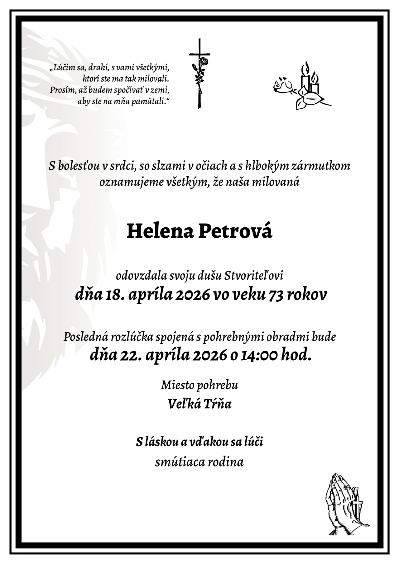 Kolektív Pohrebnej služby ULTIMA vyjadruje úprimnú účasť v bolestivých chvíľach. Prajeme rodine a blízkym veľa pokoja a vzájomnej podpory.