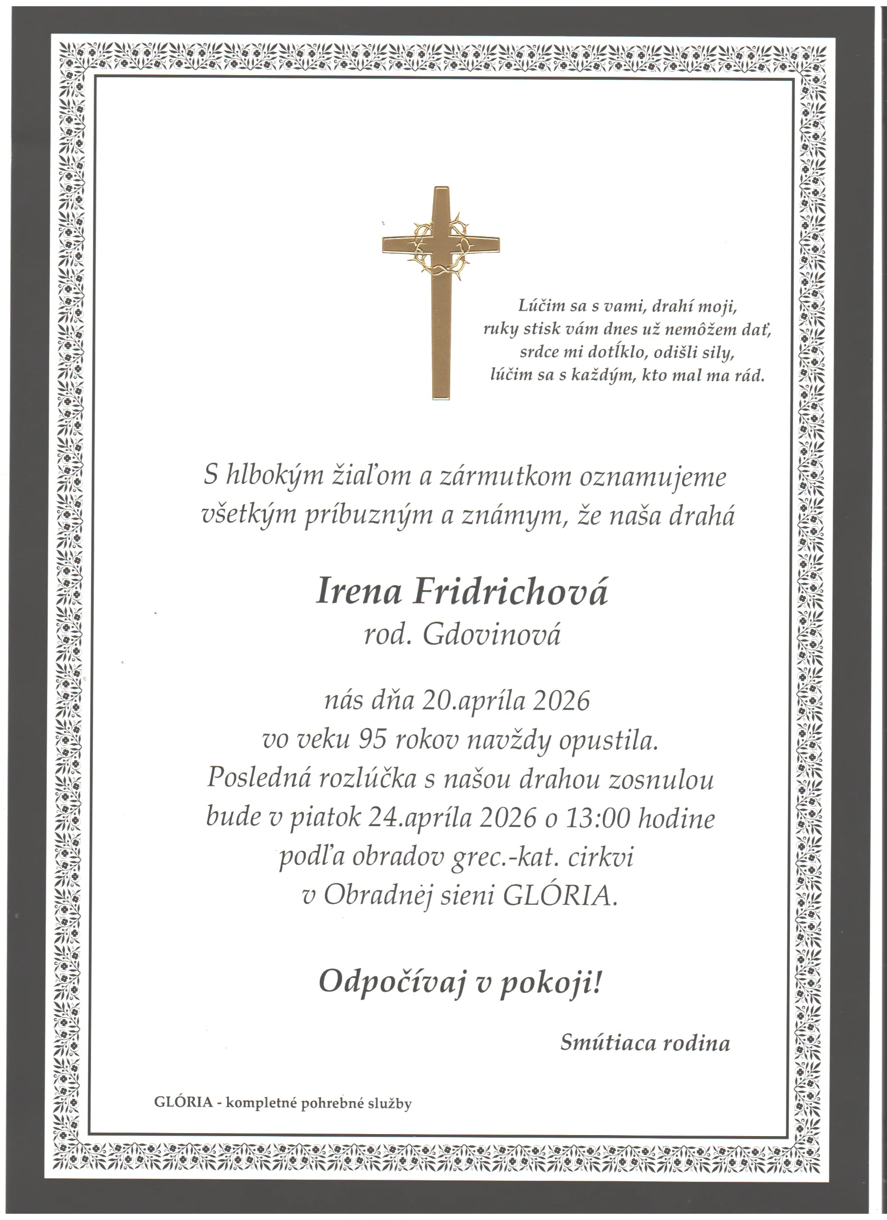 Kolektív Pohrebnej služby Glória vyjadruje úprimnú účasť v bolestivých chvíľach. Prajeme rodine a blízkym veľa pokoja a vzájomnej podpory.