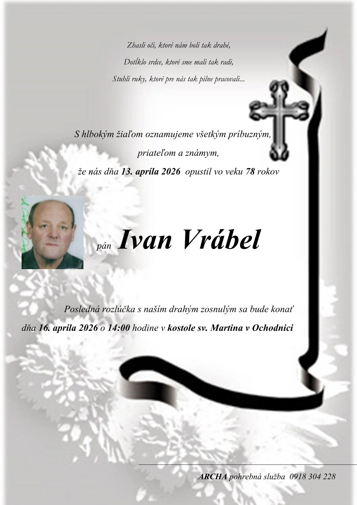 Kolektív Pohrebnej služby ARCHA vyjadruje úprimnú sústrasť rodine a blízkym. Prajeme Vám veľa síl v chvíľach smútku.