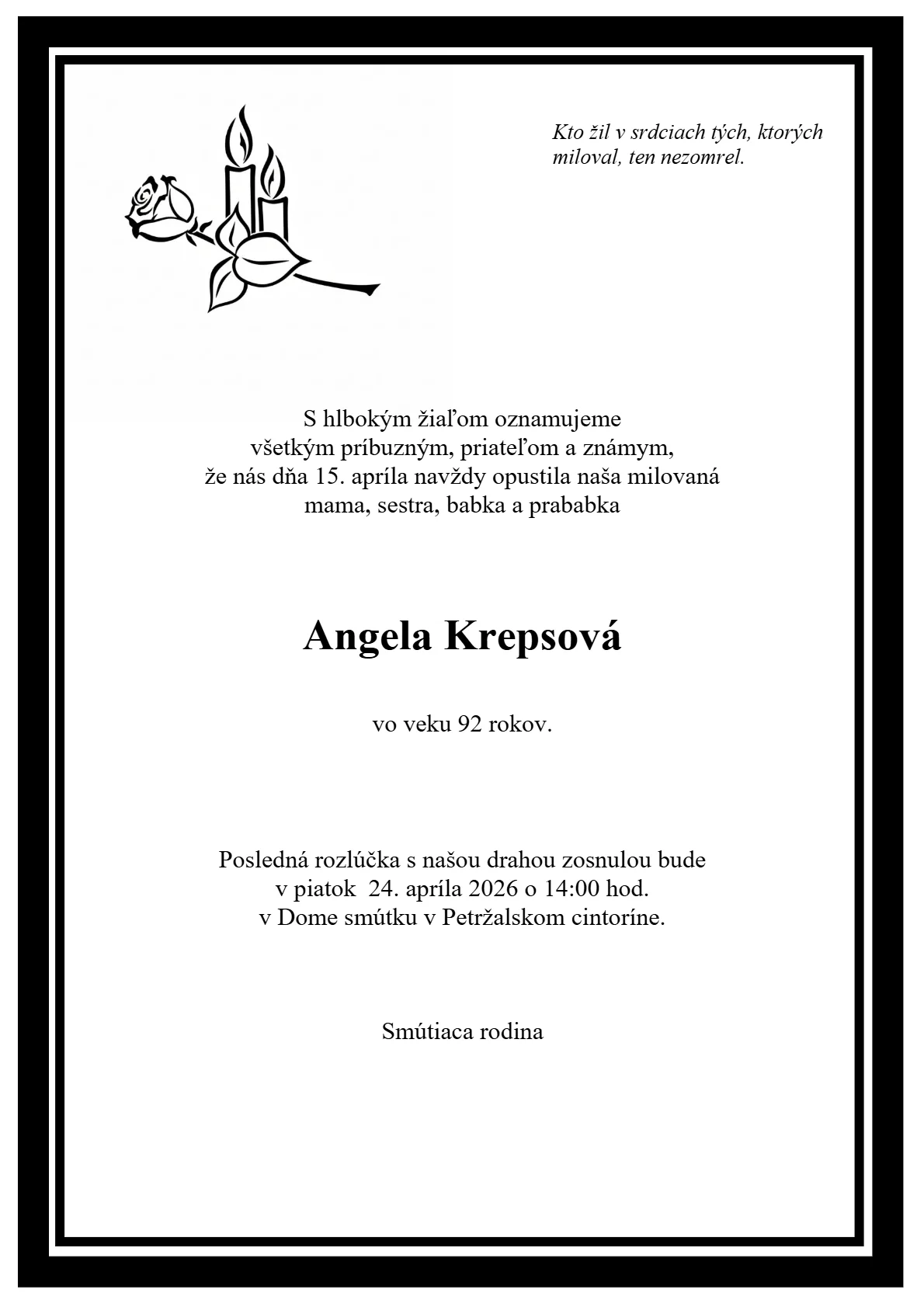 Kolektív Pohrebnej služby Silencia vyjadruje úprimnú účasť v bolestivých chvíľach. Prajeme rodine a blízkym veľa pokoja a vzájomnej podpory.