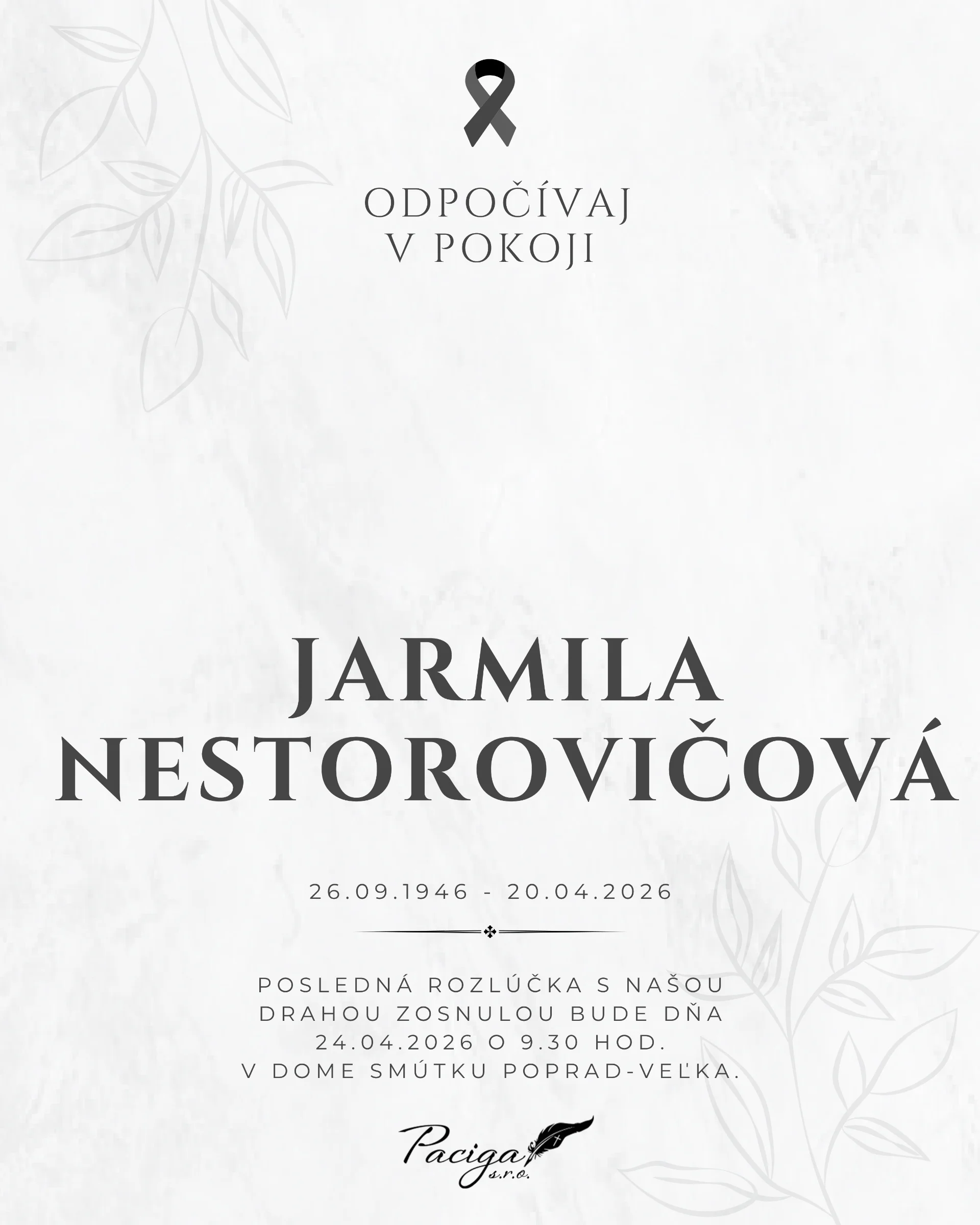 Kolektív Pohrebnej služby Paciga sa pripája k prejavom sústrasti a vyjadruje účasť všetkým pozostalým. Nech Vám zostane oporou láskavá spomienka.