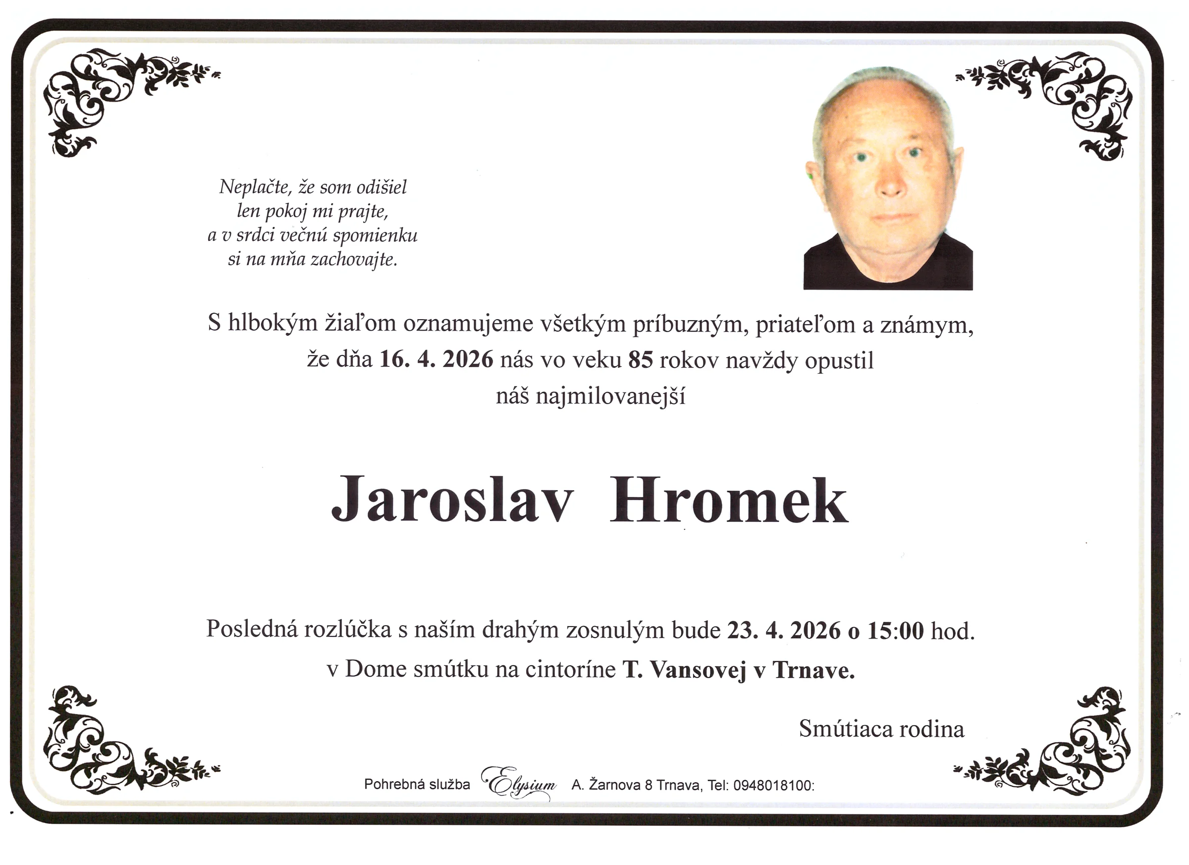 Kolektív Pohrebnej služby Elysium vyjadruje úprimnú účasť v bolestivých chvíľach. Prajeme rodine a blízkym veľa pokoja a vzájomnej podpory.