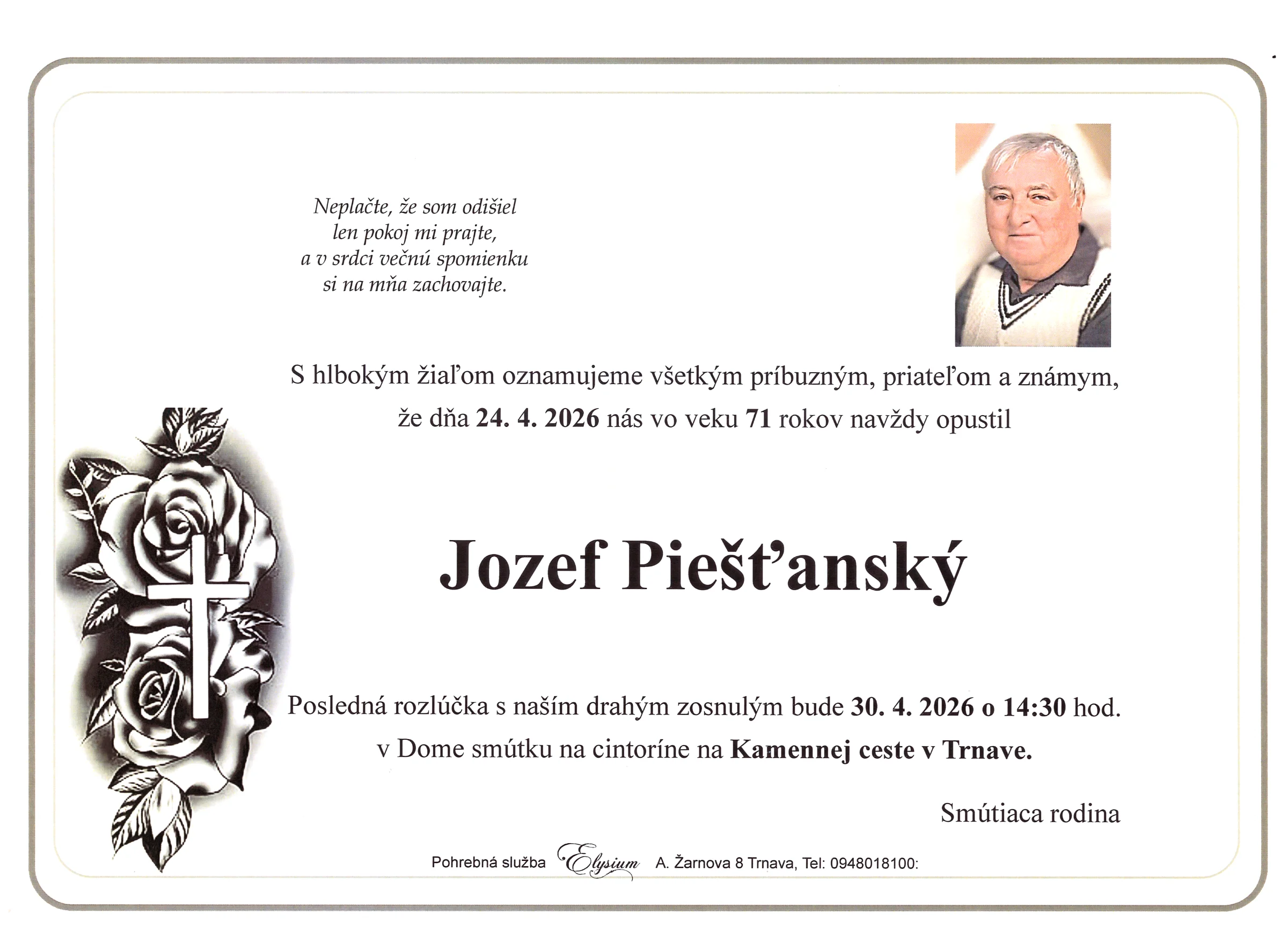 Kolektív Pohrebnej služby Elysium vyjadruje úprimnú účasť v bolestivých chvíľach. Prajeme rodine a blízkym veľa pokoja a vzájomnej podpory.
