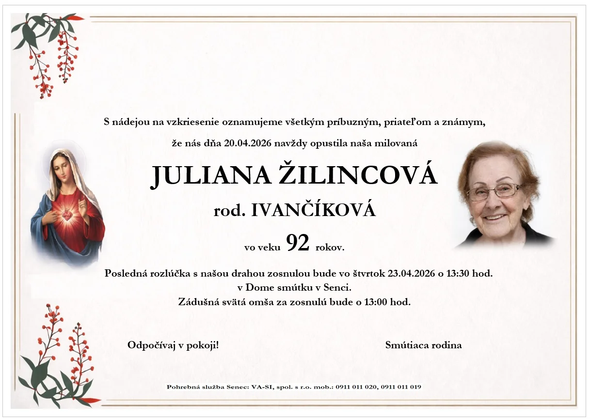 Zádušná svätá omša za zosnulú bude 23.04.2026 o 13:00 v rímskokatolíckom Kostole svätého Mikuláša v Senci.