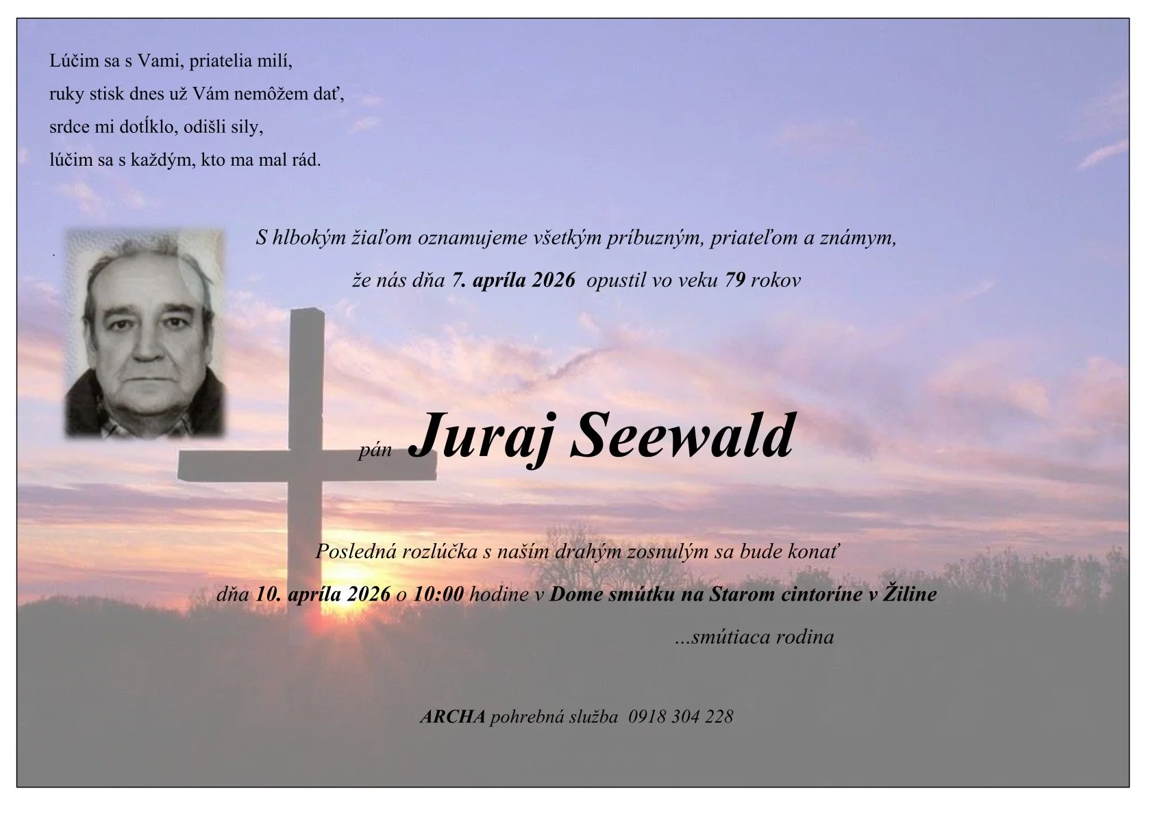 Kolektív Pohrebnej služby ARCHA vyjadruje úprimnú sústrasť rodine a blízkym. Prajeme Vám veľa síl v chvíľach smútku.