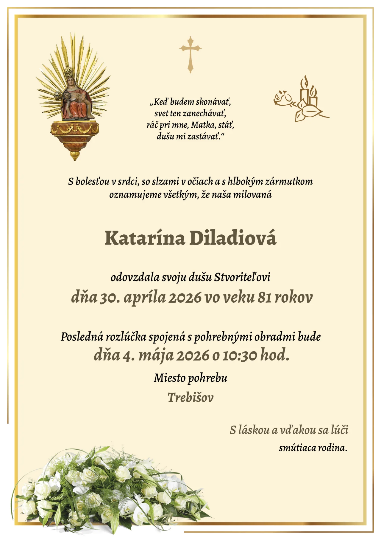 Kolektív Pohrebnej služby ULTIMA vyjadruje úprimnú účasť v bolestivých chvíľach. Prajeme rodine a blízkym veľa pokoja a vzájomnej podpory.