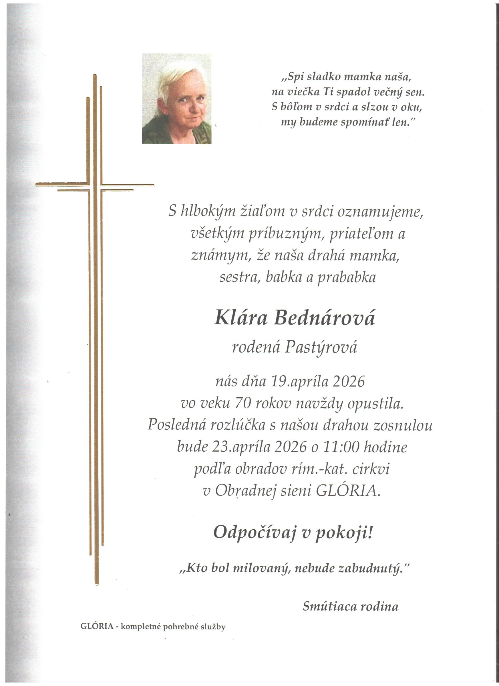 Kolektív Pohrebnej služby Glória vyjadruje úprimnú účasť v bolestivých chvíľach. Prajeme rodine a blízkym veľa pokoja a vzájomnej podpory.