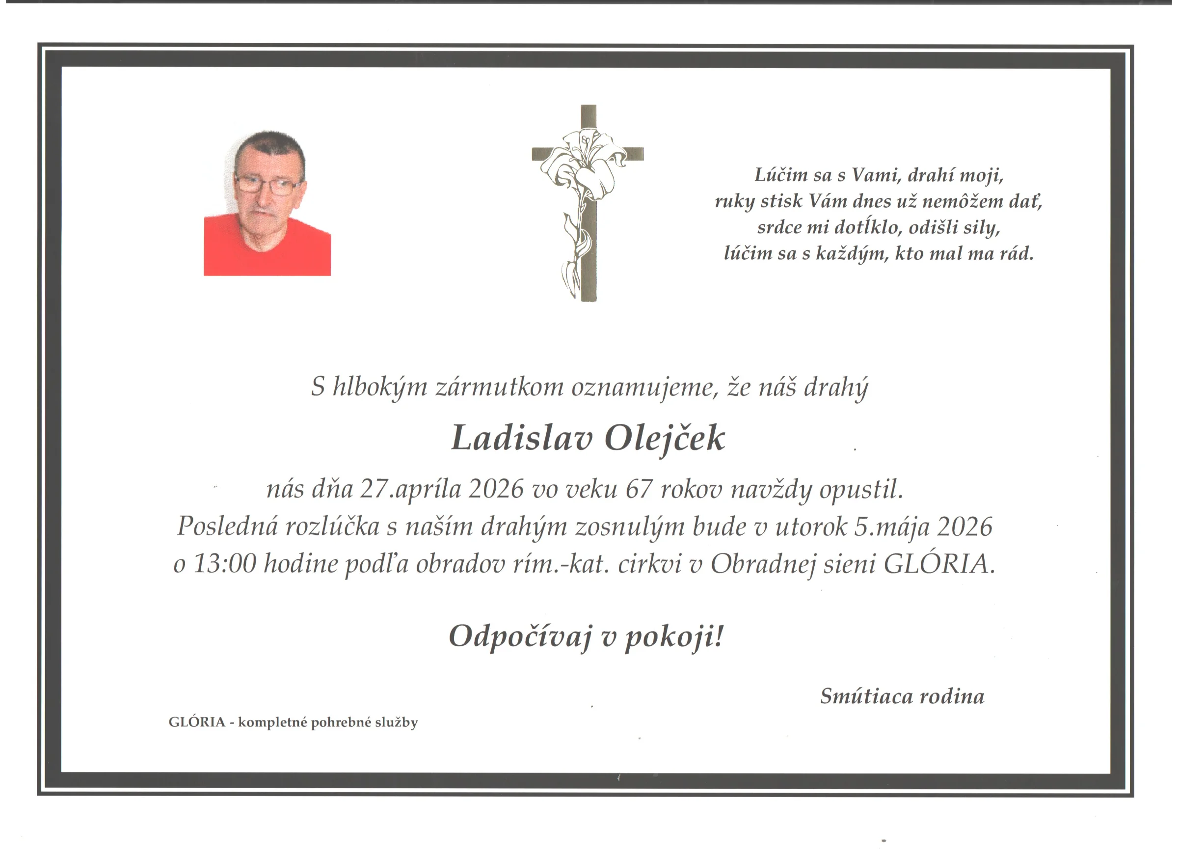 Kolektív Pohrebnej služby Glória vyjadruje úprimnú účasť v bolestivých chvíľach. Prajeme rodine a blízkym veľa pokoja a vzájomnej podpory.
