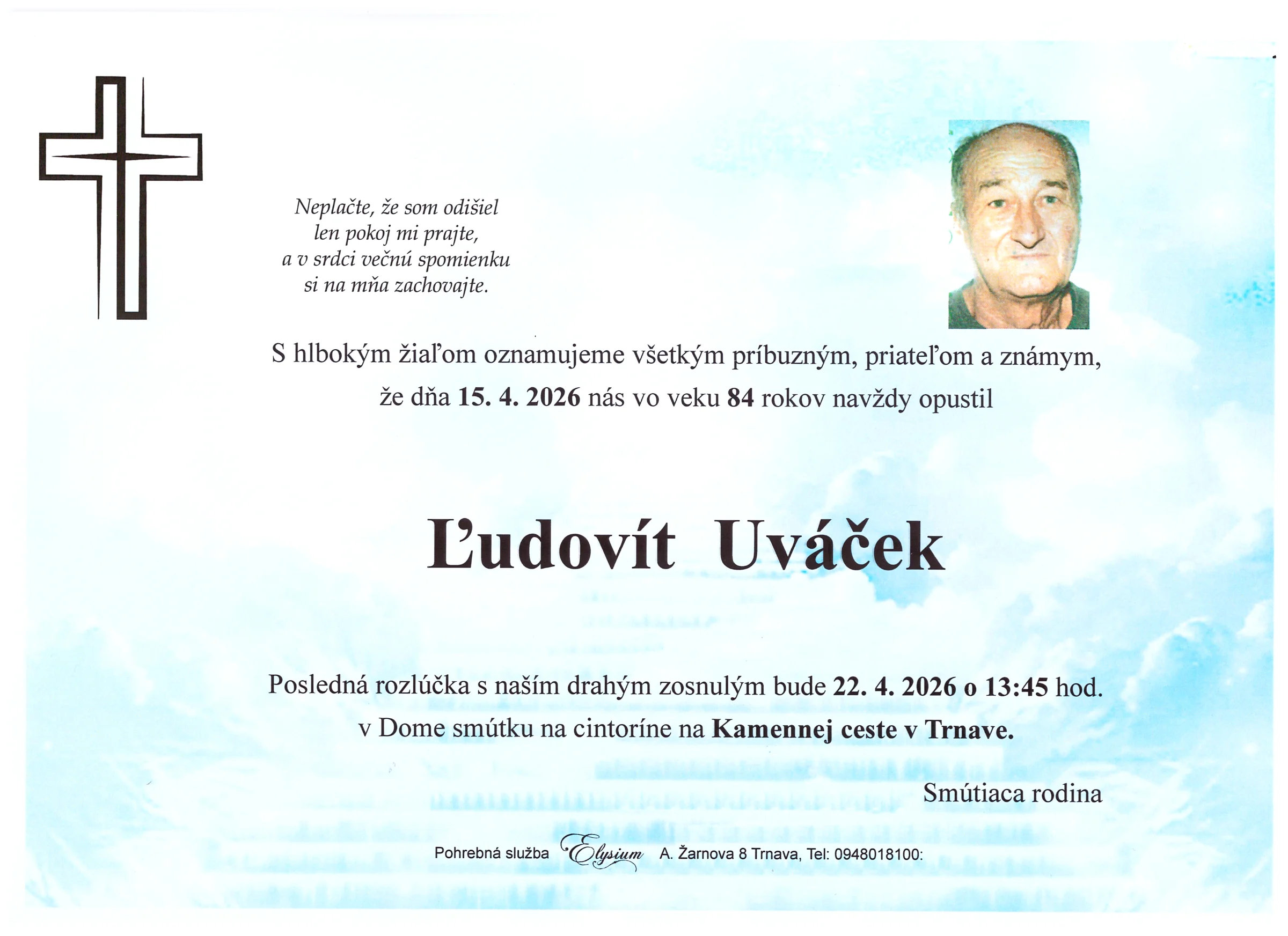 Kolektív Pohrebnej služby Elysium vyjadruje úprimnú účasť v bolestivých chvíľach. Prajeme rodine a blízkym veľa pokoja a vzájomnej podpory.