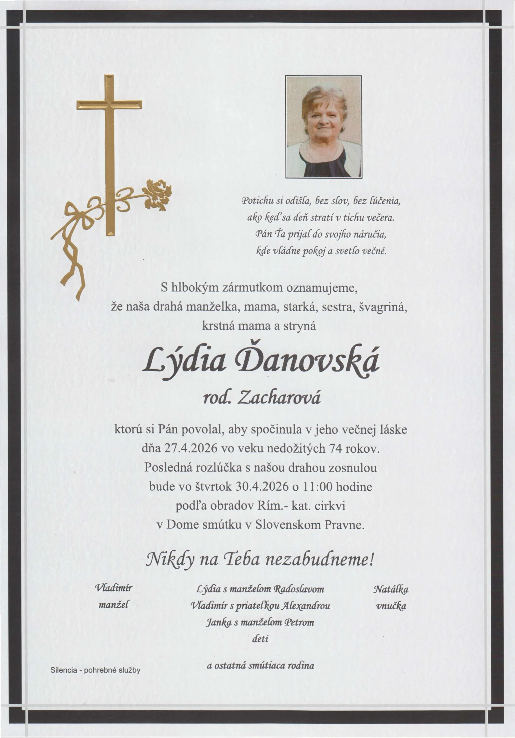 Kolektív Pohrebnej služby Silencia vyjadruje úprimnú účasť v bolestivých chvíľach. Prajeme rodine a blízkym veľa pokoja a vzájomnej podpory.