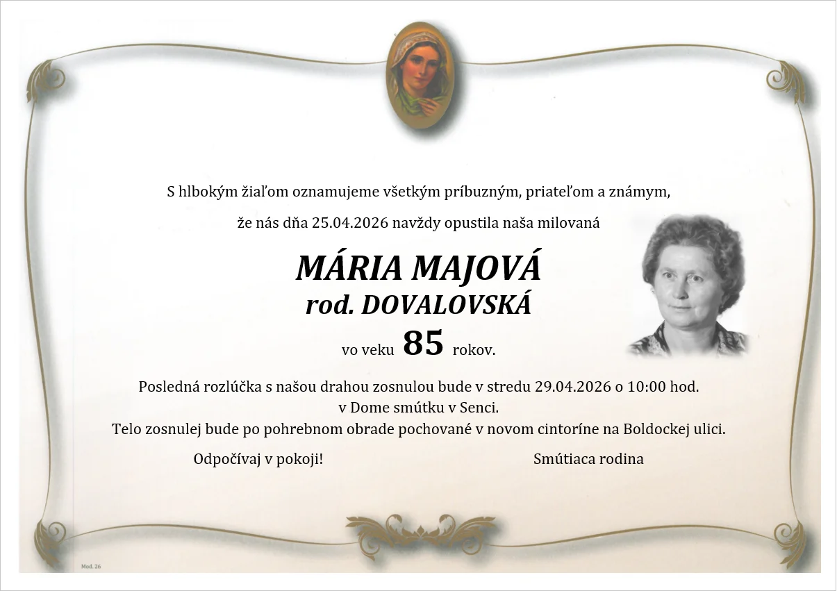 V týchto ťažkých chvíľach vyjadrujeme úprimnú sústrasť rodine, príbuzným a všetkým blízkym. Nech zostanú živé najmä krásne spomienky.
