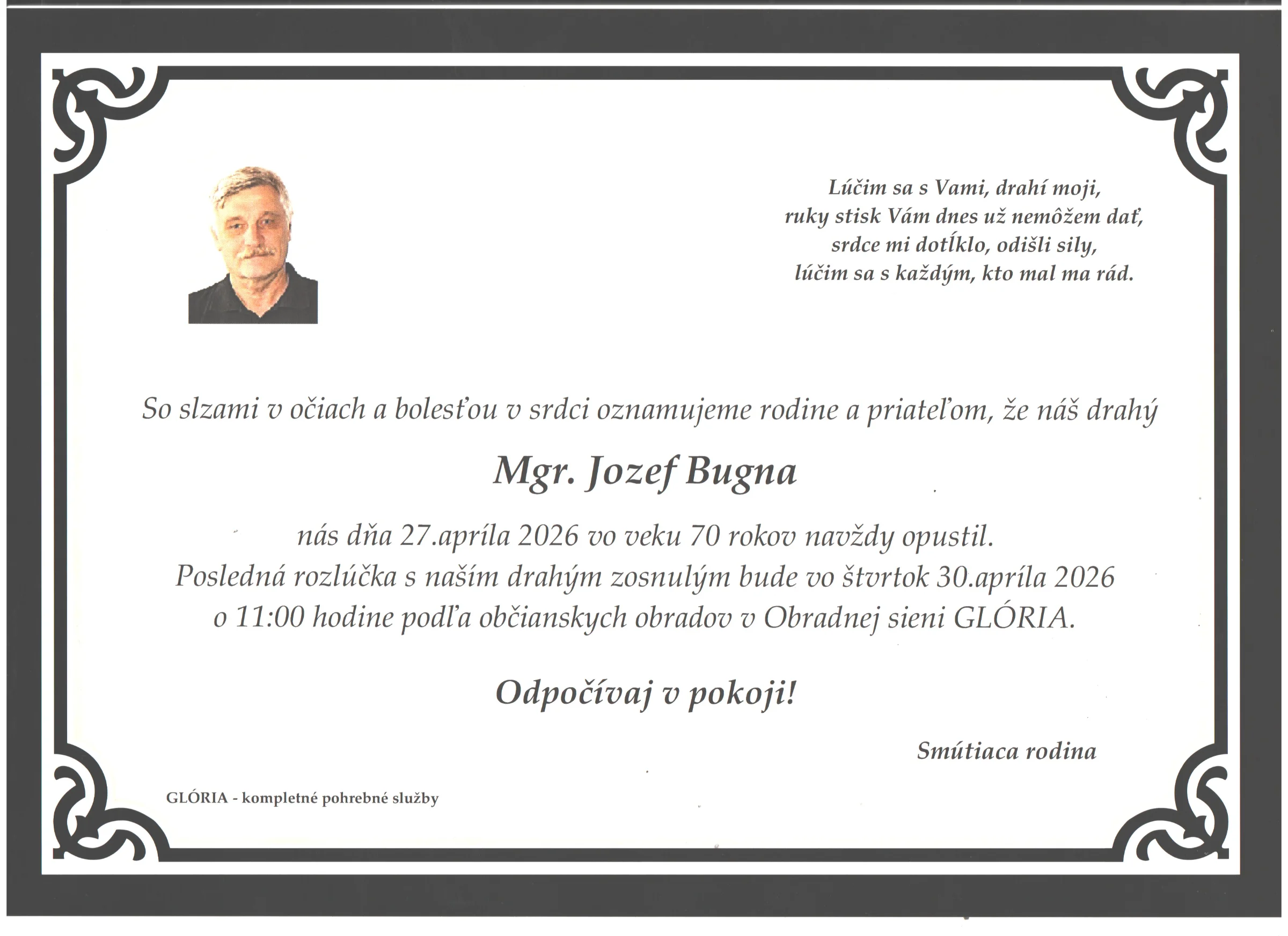 Kolektív Pohrebnej služby Glória vyjadruje úprimnú účasť v bolestivých chvíľach. Prajeme rodine a blízkym veľa pokoja a vzájomnej podpory.