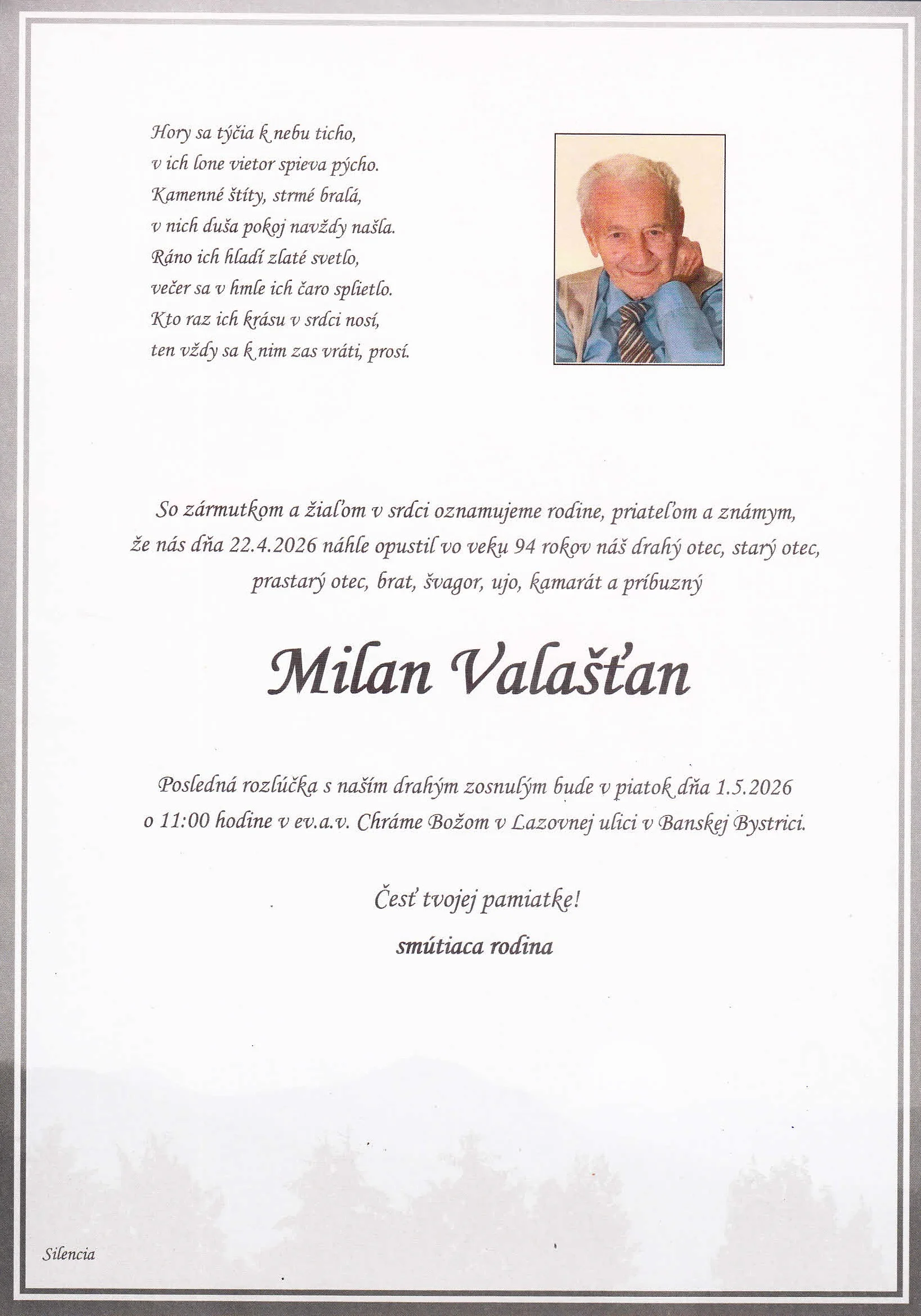 Kolektív Pohrebnej služby Silencia vyjadruje úprimnú účasť v bolestivých chvíľach. Prajeme rodine a blízkym veľa pokoja a vzájomnej podpory.