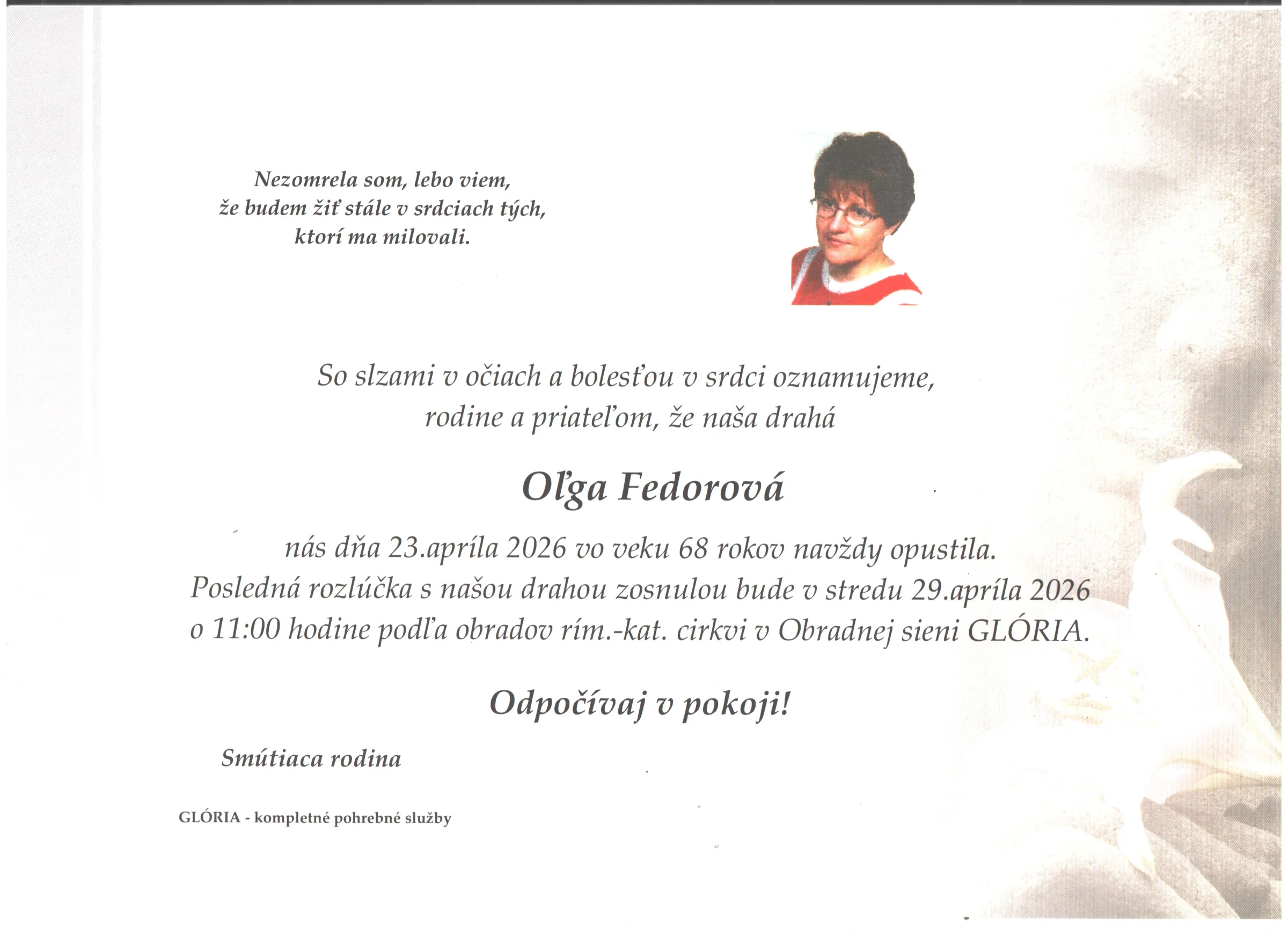 Kolektív Pohrebnej služby Glória vyjadruje úprimnú účasť v bolestivých chvíľach. Prajeme rodine a blízkym veľa pokoja a vzájomnej podpory.