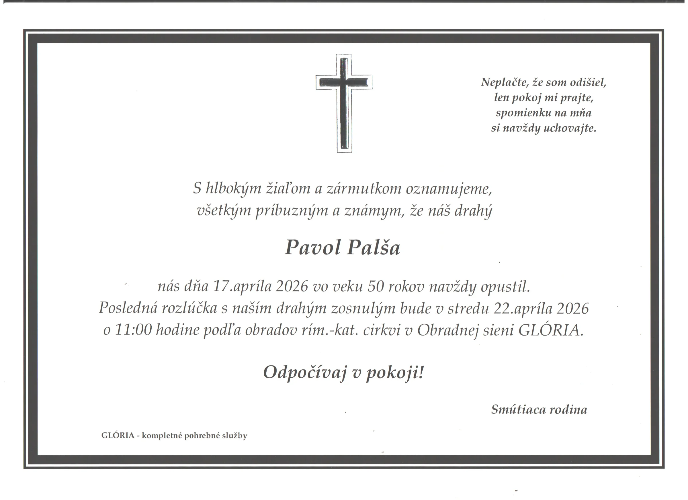 Kolektív Pohrebnej služby Glória vyjadruje úprimnú účasť v bolestivých chvíľach. Prajeme rodine a blízkym veľa pokoja a vzájomnej podpory.