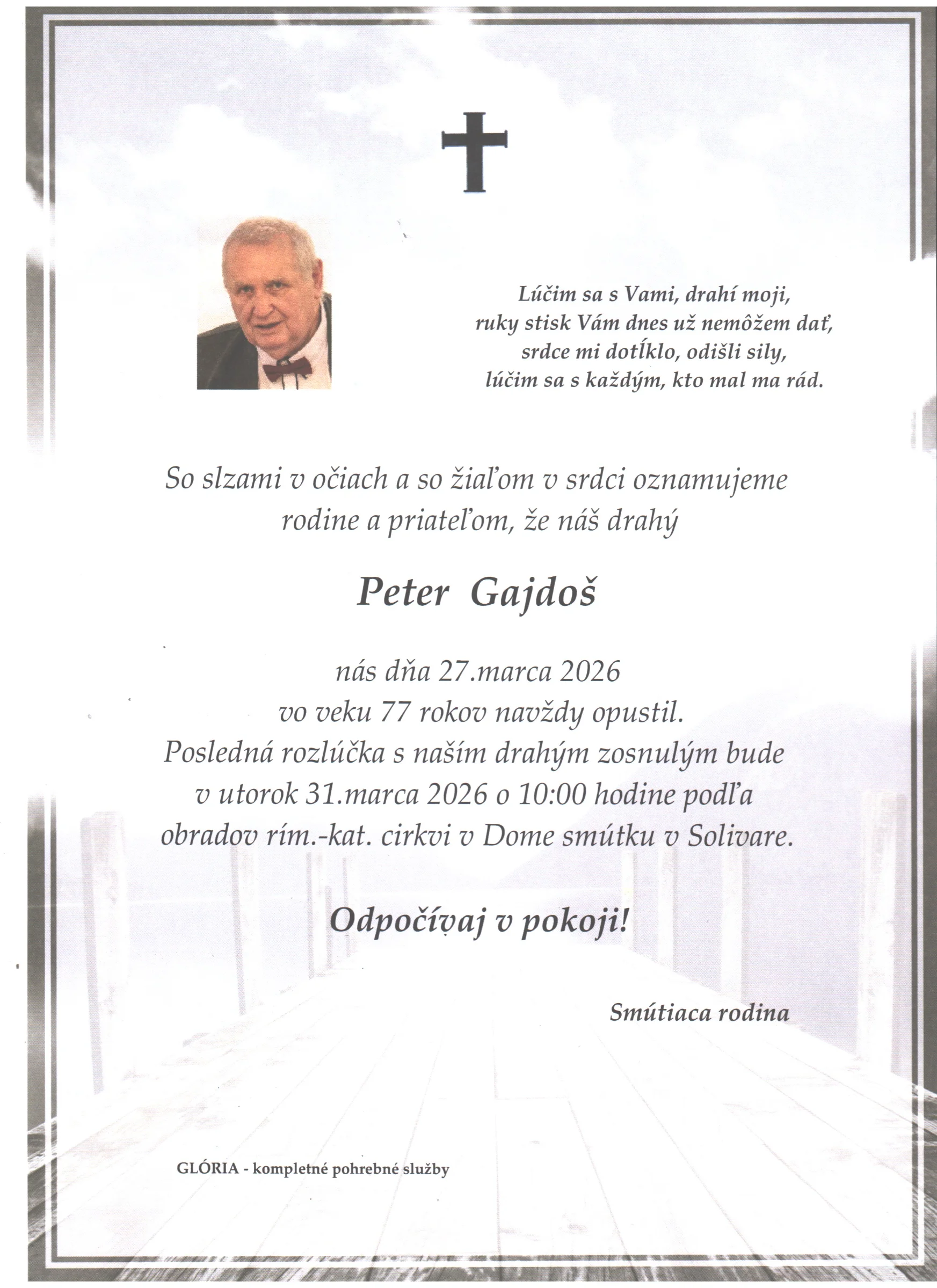 Kolektív Pohrebnej služby Glória vyjadruje úprimnú účasť v bolestivých chvíľach. Prajeme rodine a blízkym veľa pokoja a vzájomnej podpory.