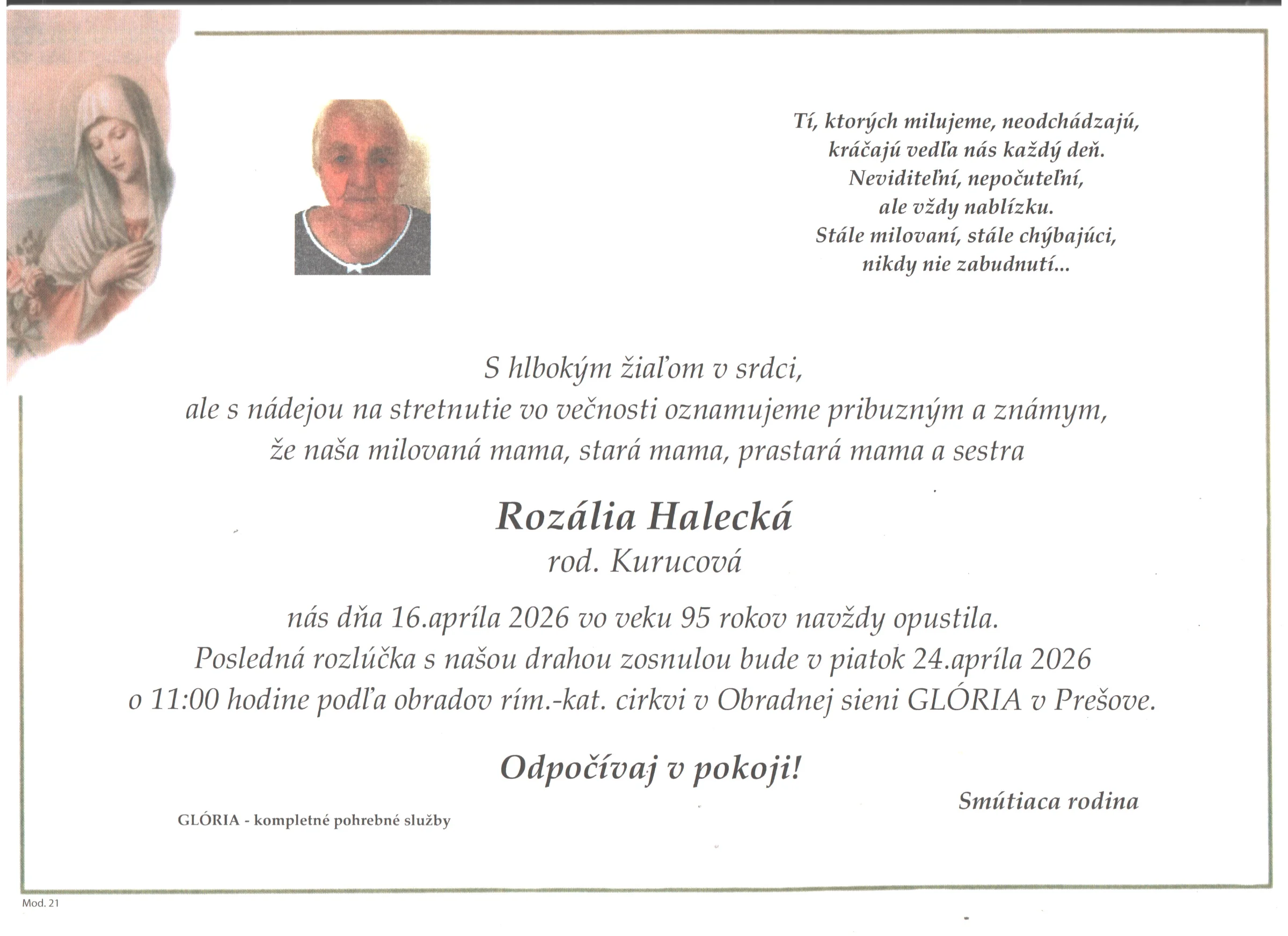 Kolektív Pohrebnej služby Glória vyjadruje úprimnú účasť v bolestivých chvíľach. Prajeme rodine a blízkym veľa pokoja a vzájomnej podpory.