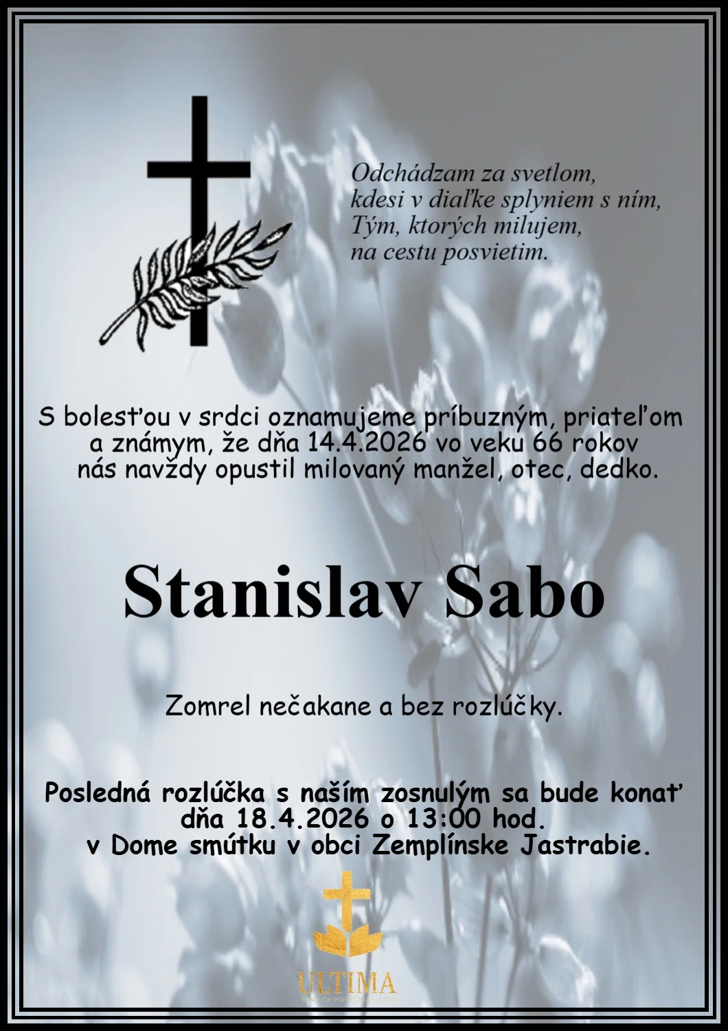 Kolektív Pohrebnej služby ULTIMA vyjadruje úprimnú účasť v bolestivých chvíľach. Prajeme rodine a blízkym veľa pokoja a vzájomnej podpory.