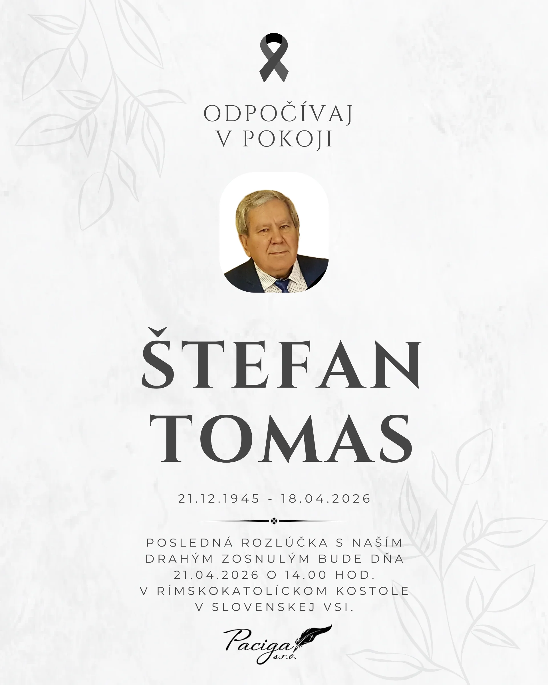 Kolektív Pohrebnej služby Paciga sa pripája k prejavom sústrasti a vyjadruje účasť všetkým pozostalým. Nech Vám zostane oporou láskavá spomienka.