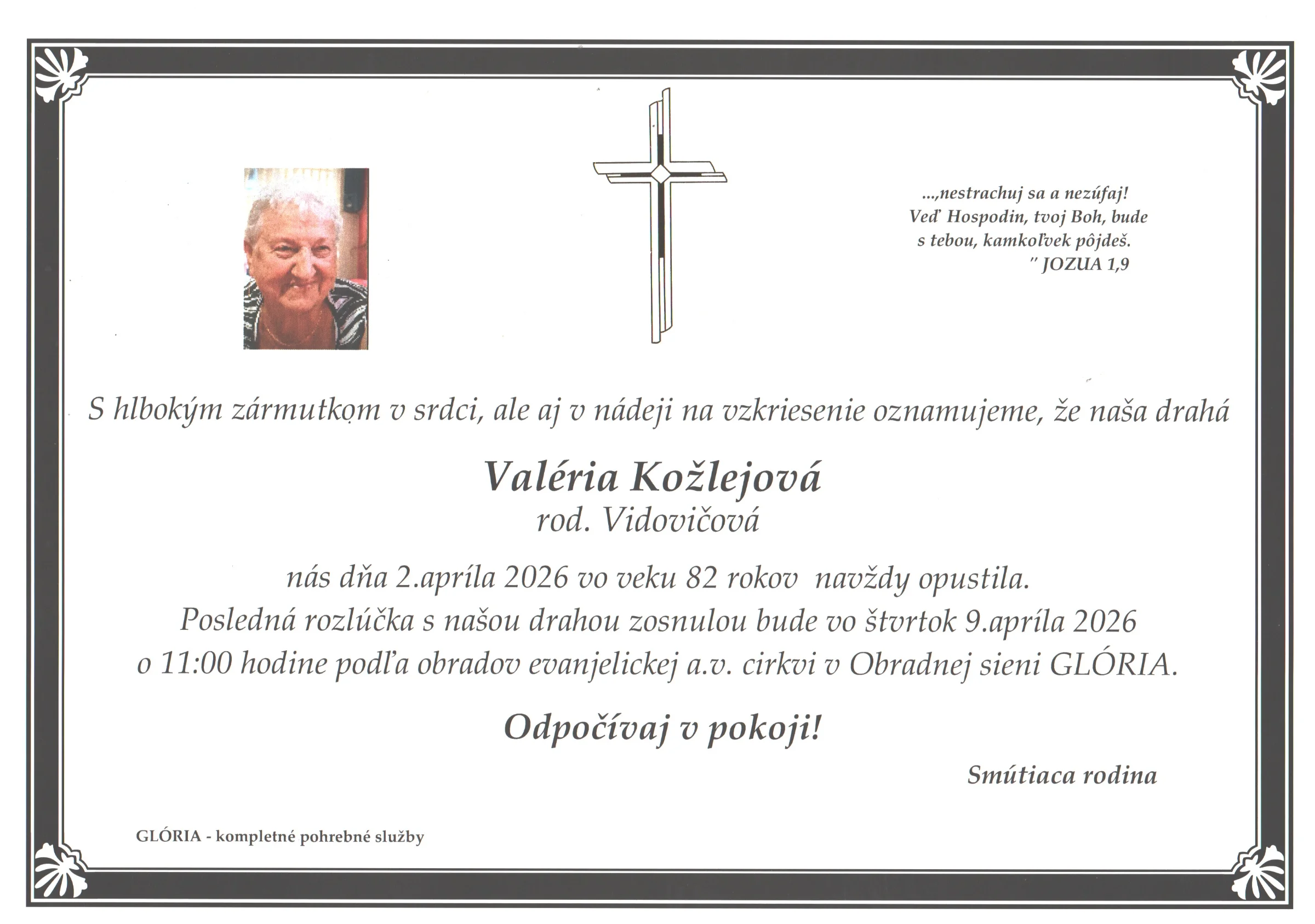 Kolektív Pohrebnej služby Glória vyjadruje úprimnú účasť v bolestivých chvíľach. Prajeme rodine a blízkym veľa pokoja a vzájomnej podpory.
