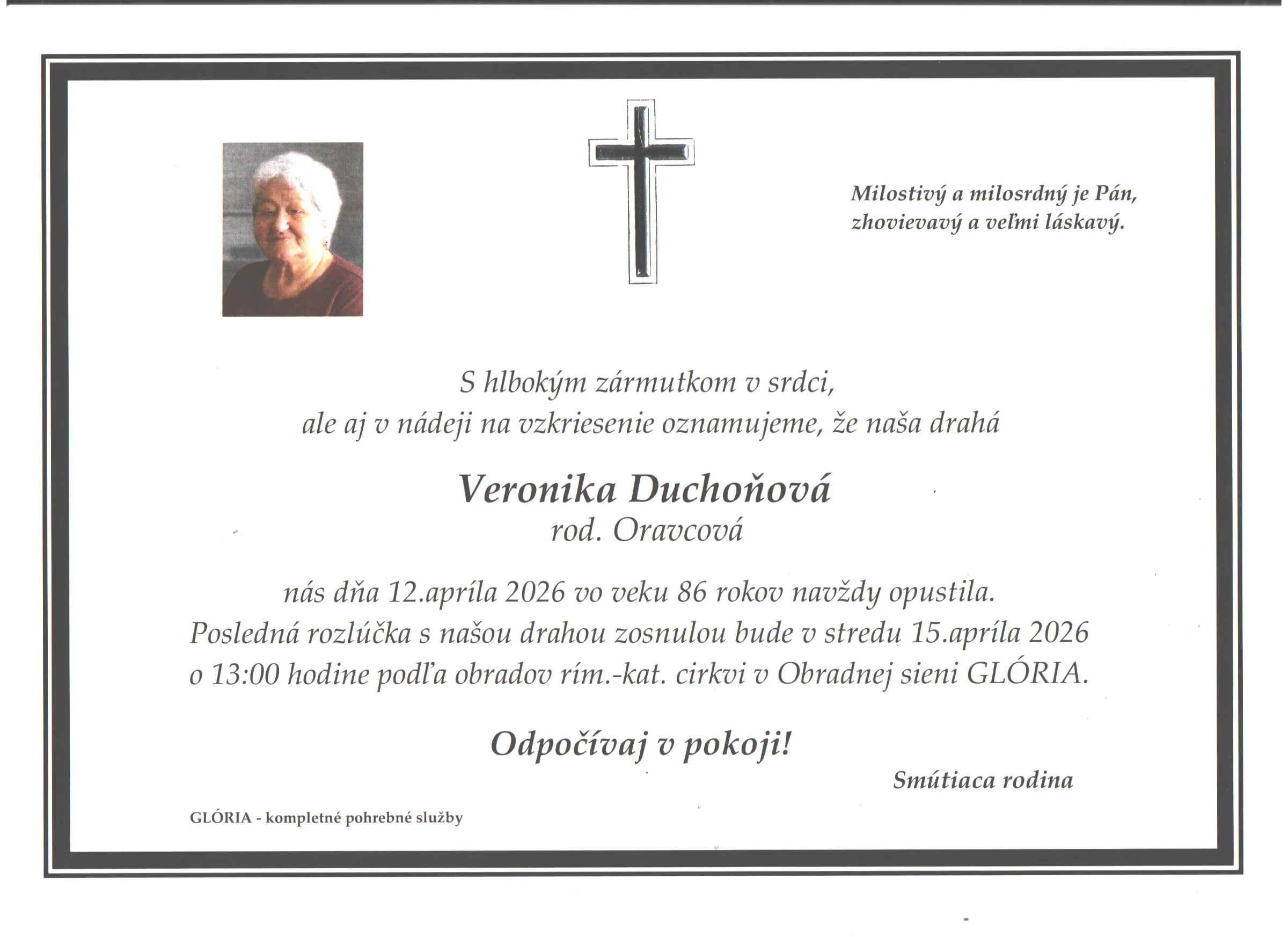 Kolektív Pohrebnej služby Glória vyjadruje úprimnú účasť v bolestivých chvíľach. Prajeme rodine a blízkym veľa pokoja a vzájomnej podpory.