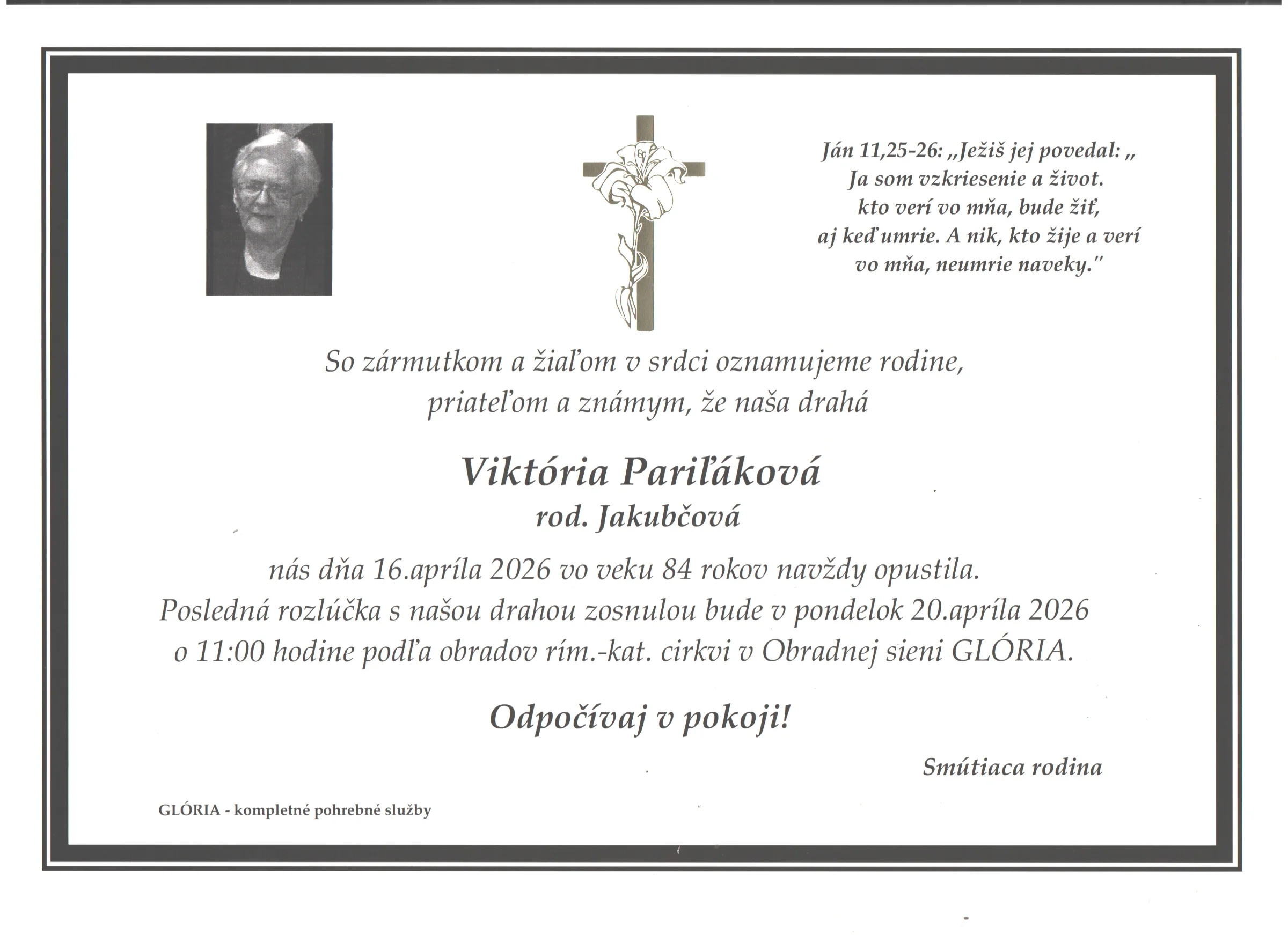 Kolektív Pohrebnej služby Glória vyjadruje úprimnú účasť v bolestivých chvíľach. Prajeme rodine a blízkym veľa pokoja a vzájomnej podpory.