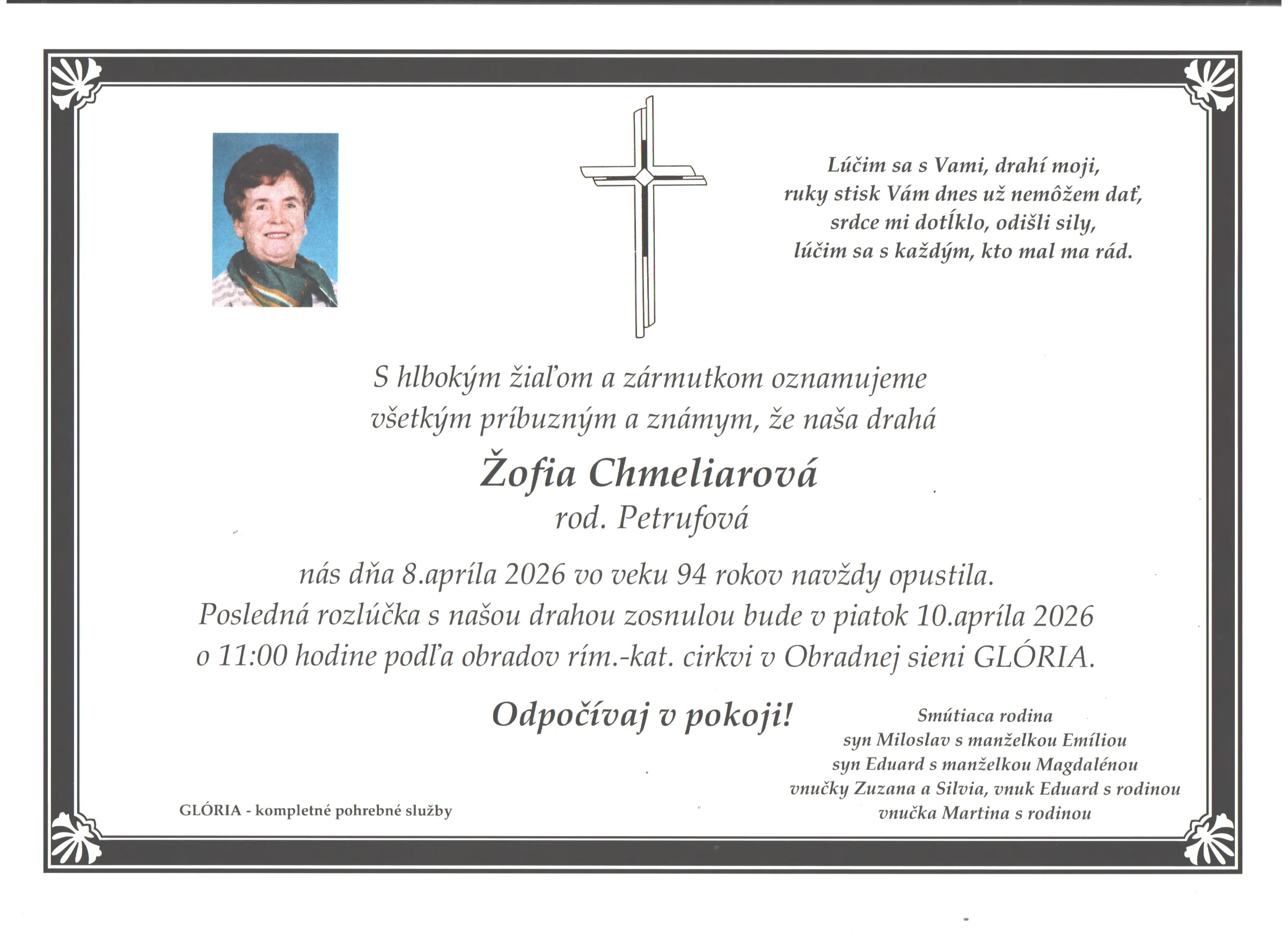 Kolektív Pohrebnej služby Glória vyjadruje úprimnú účasť v bolestivých chvíľach. Prajeme rodine a blízkym veľa pokoja a vzájomnej podpory.